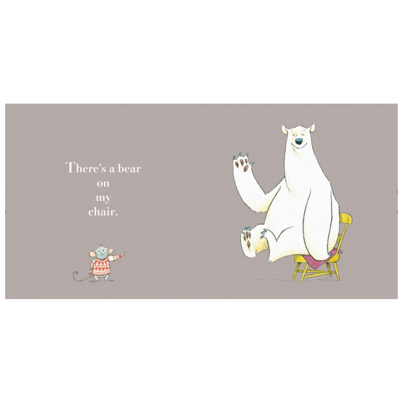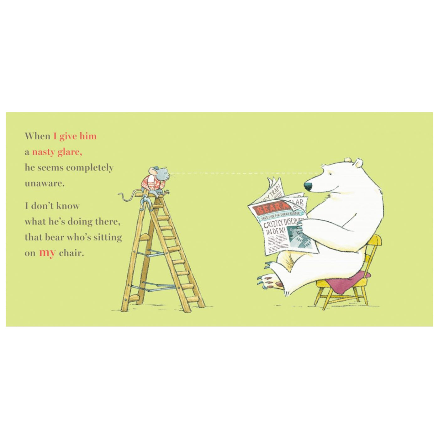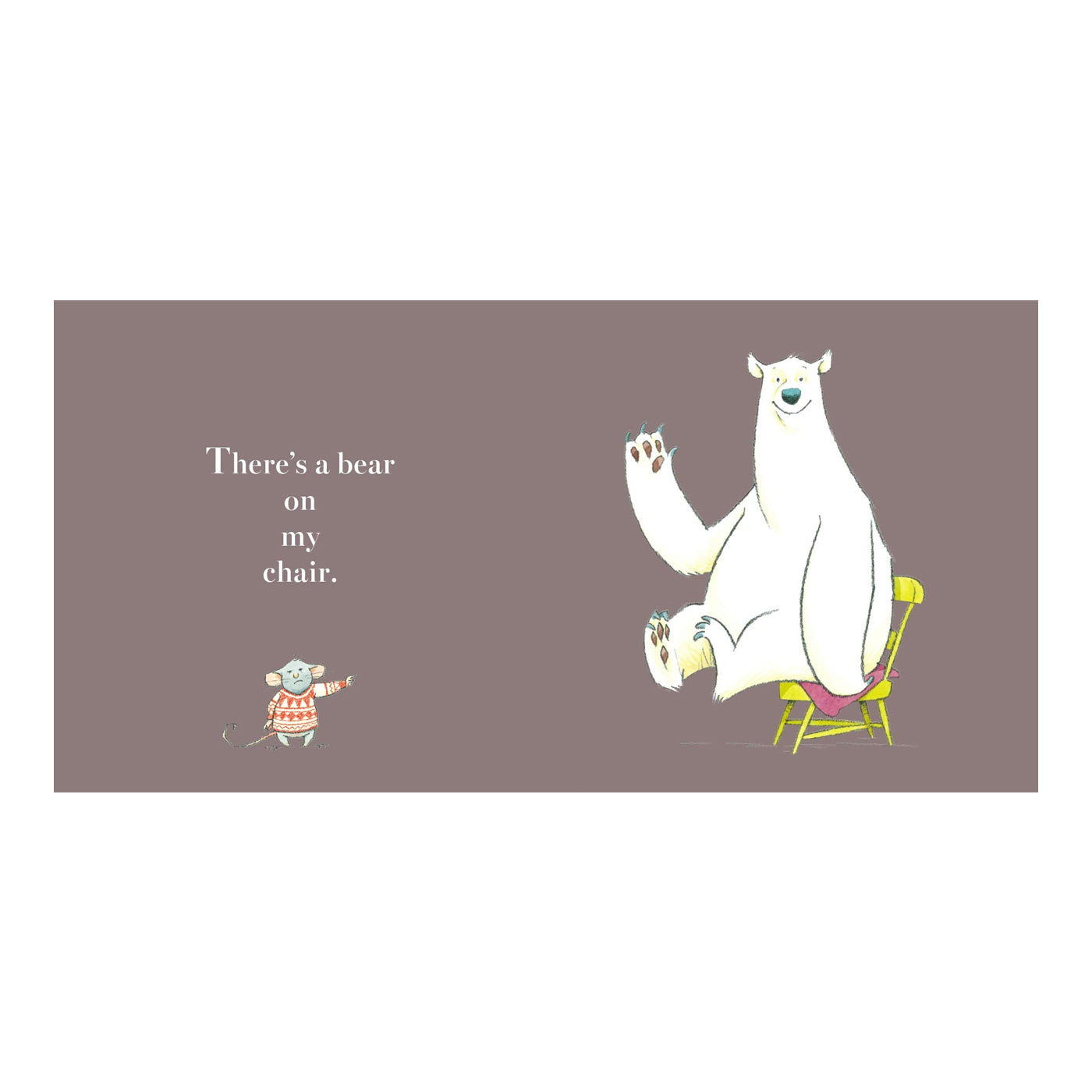 Küçük bir fare, sandalyesine oturan ayının oradan kalkmasını istiyor. Çünkü o farenin sandalyesi. Ne yaparsa yapsın ayı yerinden kalmıyor. Acaba fare ayıyı kaldırabilecek mi yoksa sandalyeyi ona bırakıp gidecek mi?