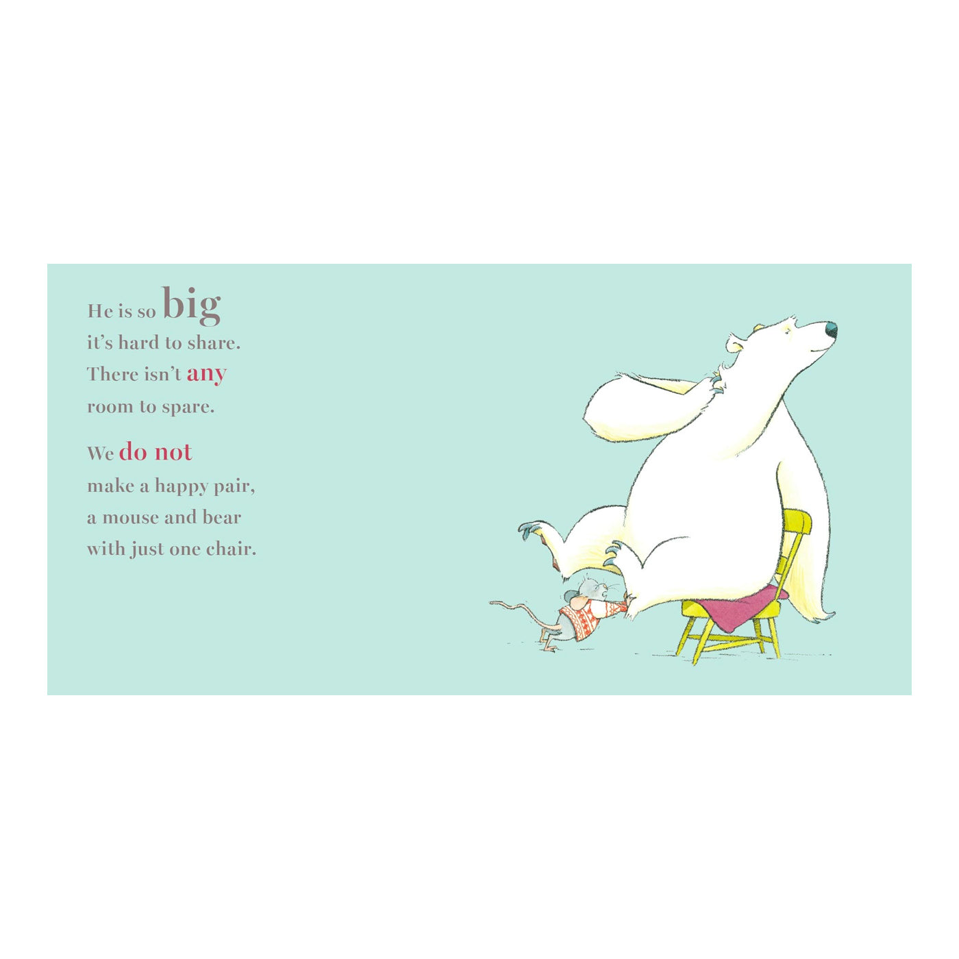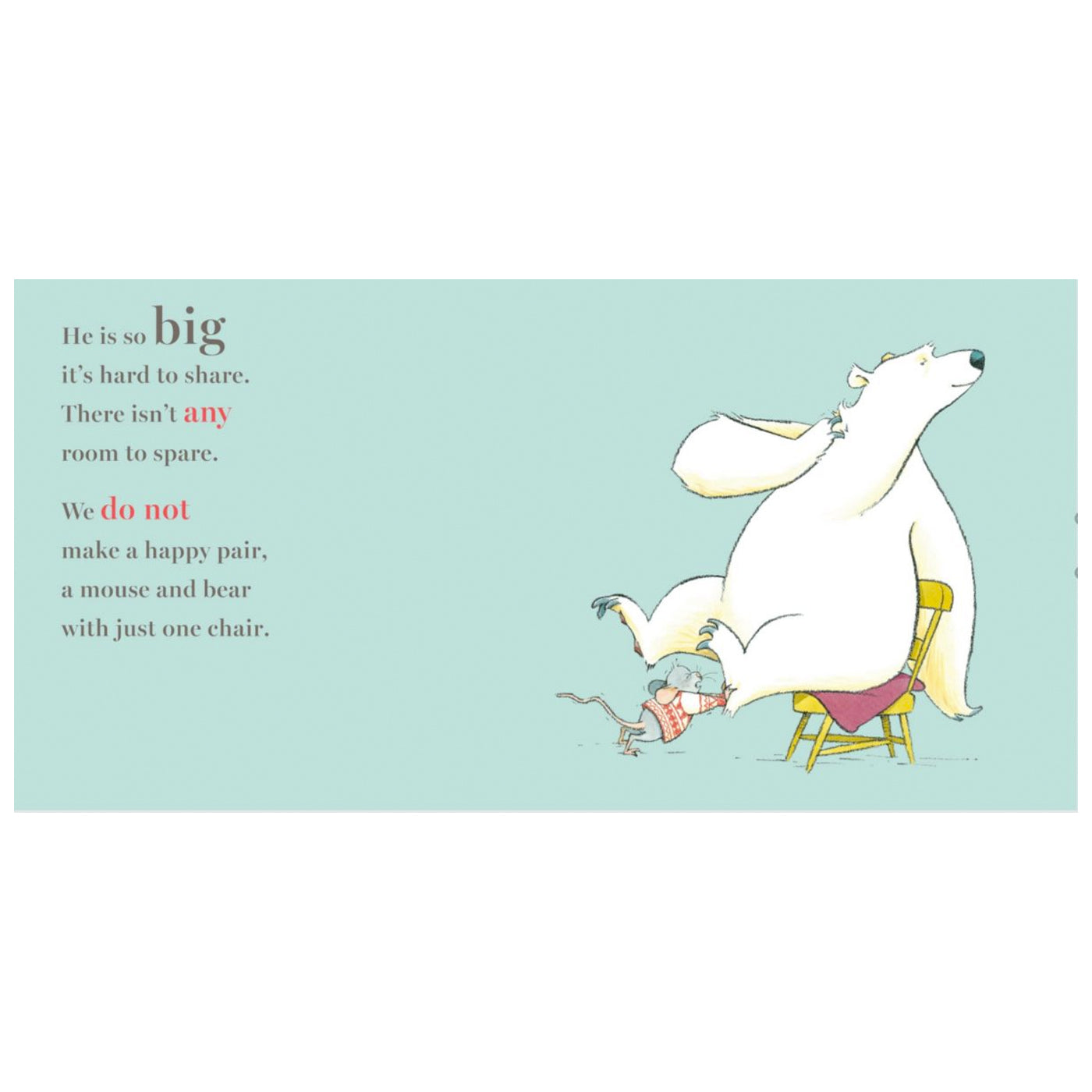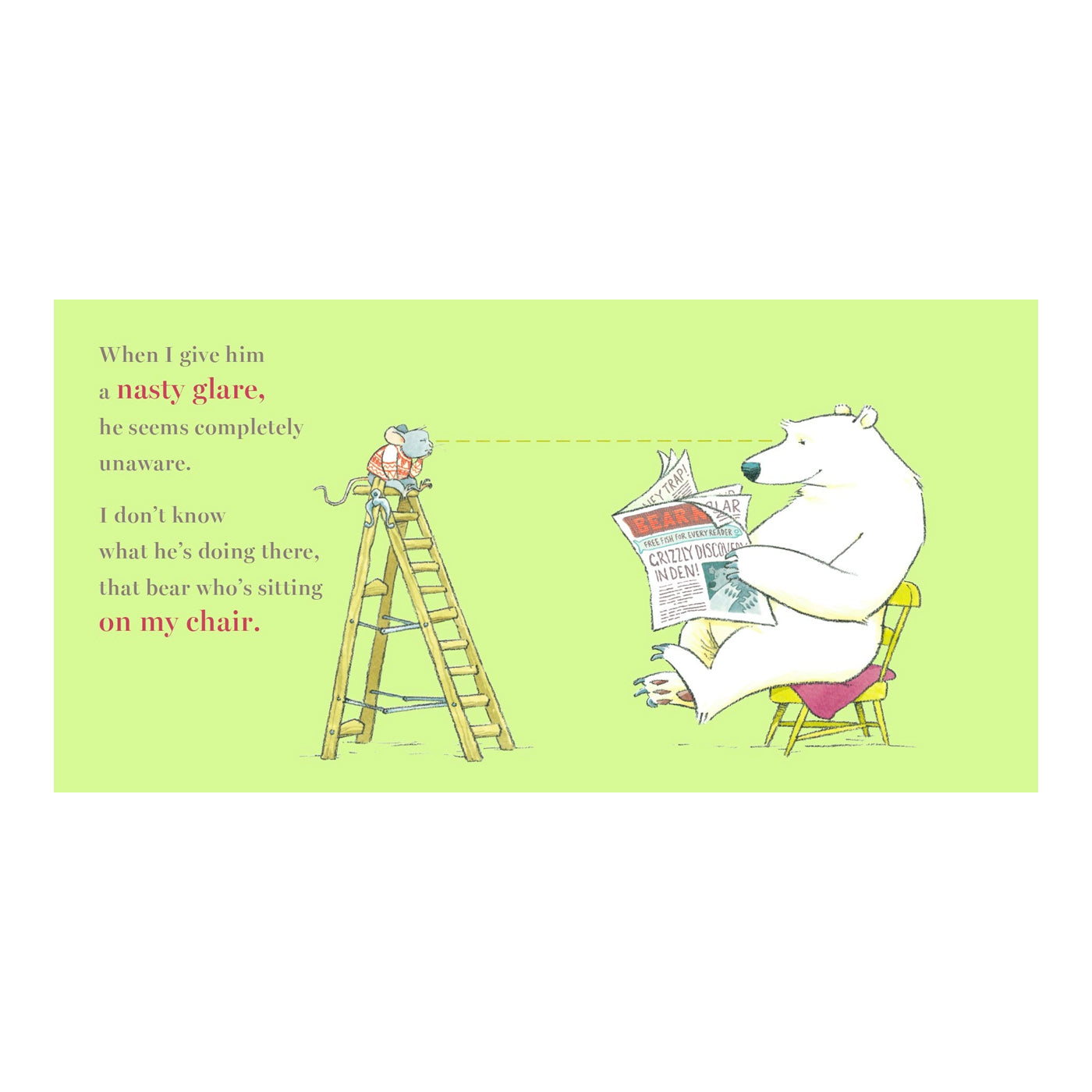 Küçük bir fare, sandalyesine oturan ayının oradan kalkmasını istiyor. Çünkü o farenin sandalyesi. Ne yaparsa yapsın ayı yerinden kalmıyor. Acaba fare ayıyı kaldırabilecek mi yoksa sandalyeyi ona bırakıp gidecek mi?