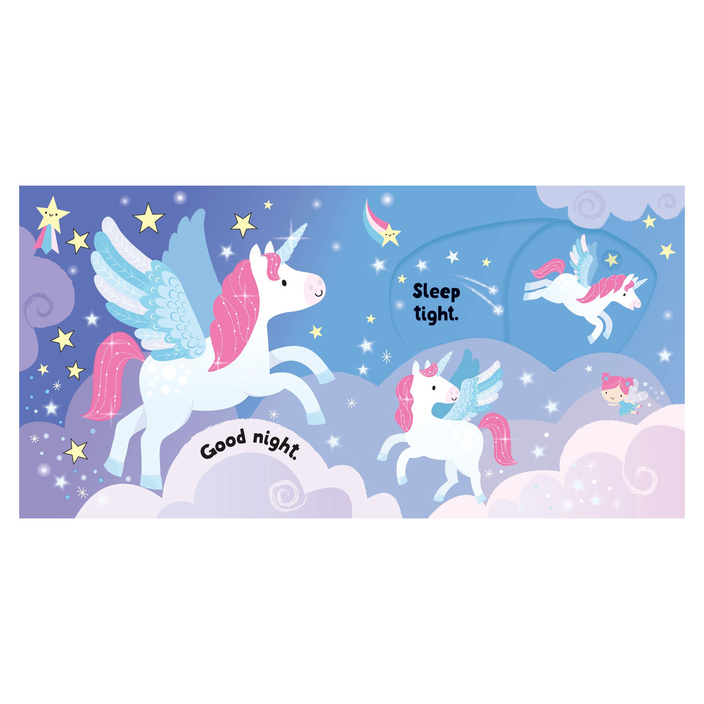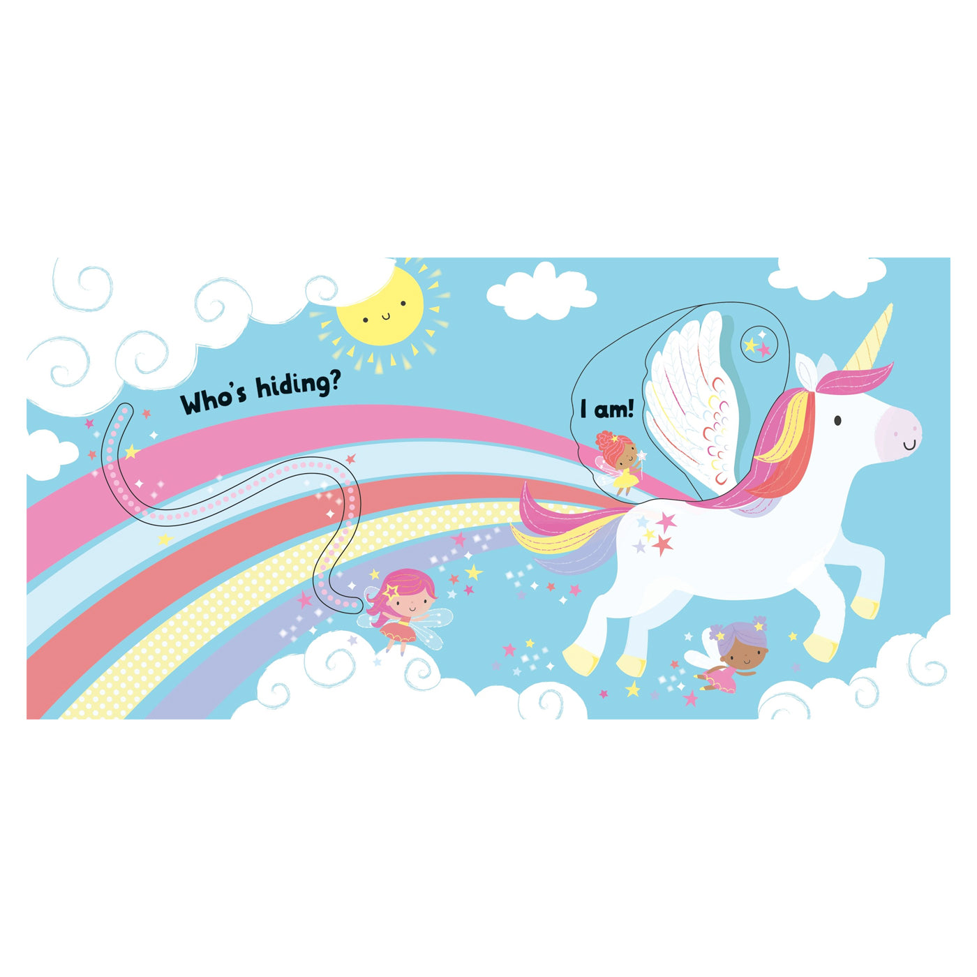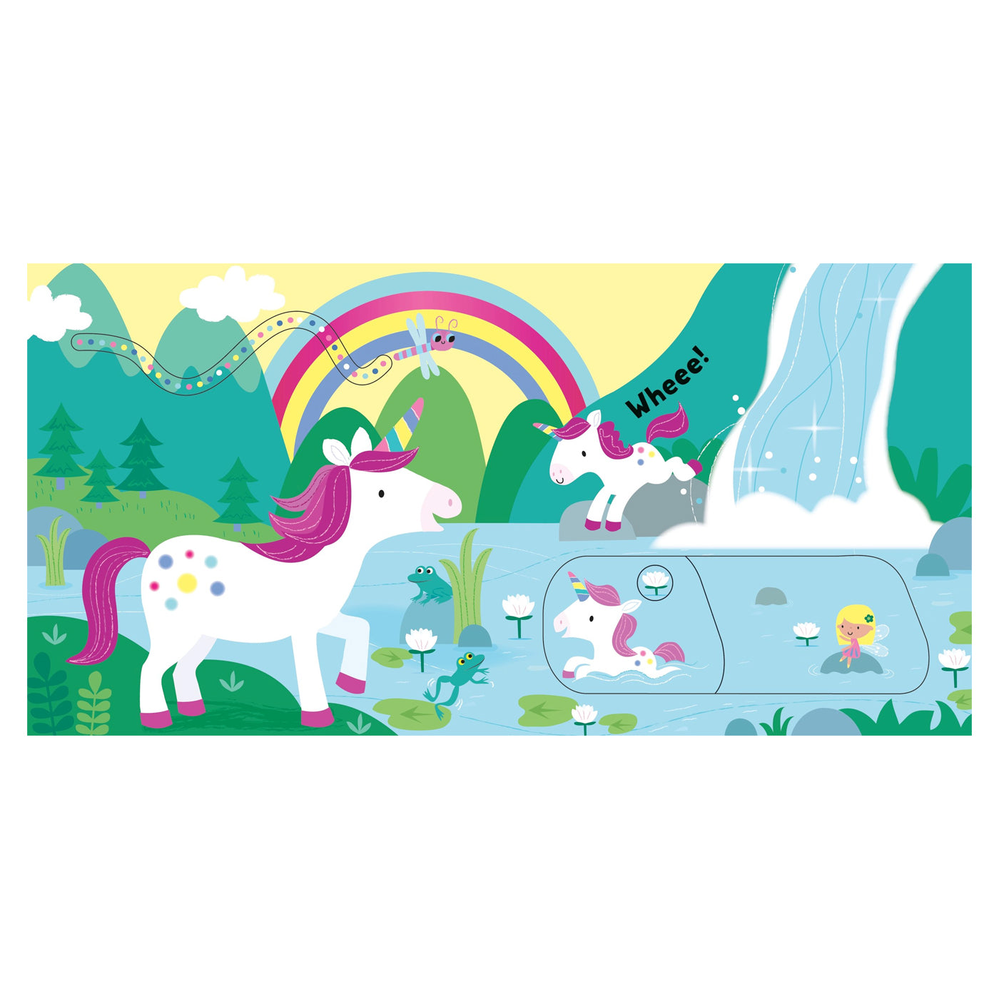 Gökkuşağının üzerinde uçarken, büyülü bir ormanı keşfederken ve ve yine büyülü bir göle girerken tek boynuzlu atlara ve peri arkadaşlarına katılın. Gizlenmiş küçük sürprizleri ortaya çıkarmak için sürgülü kısımları hareket ettirmeniz yeterli.