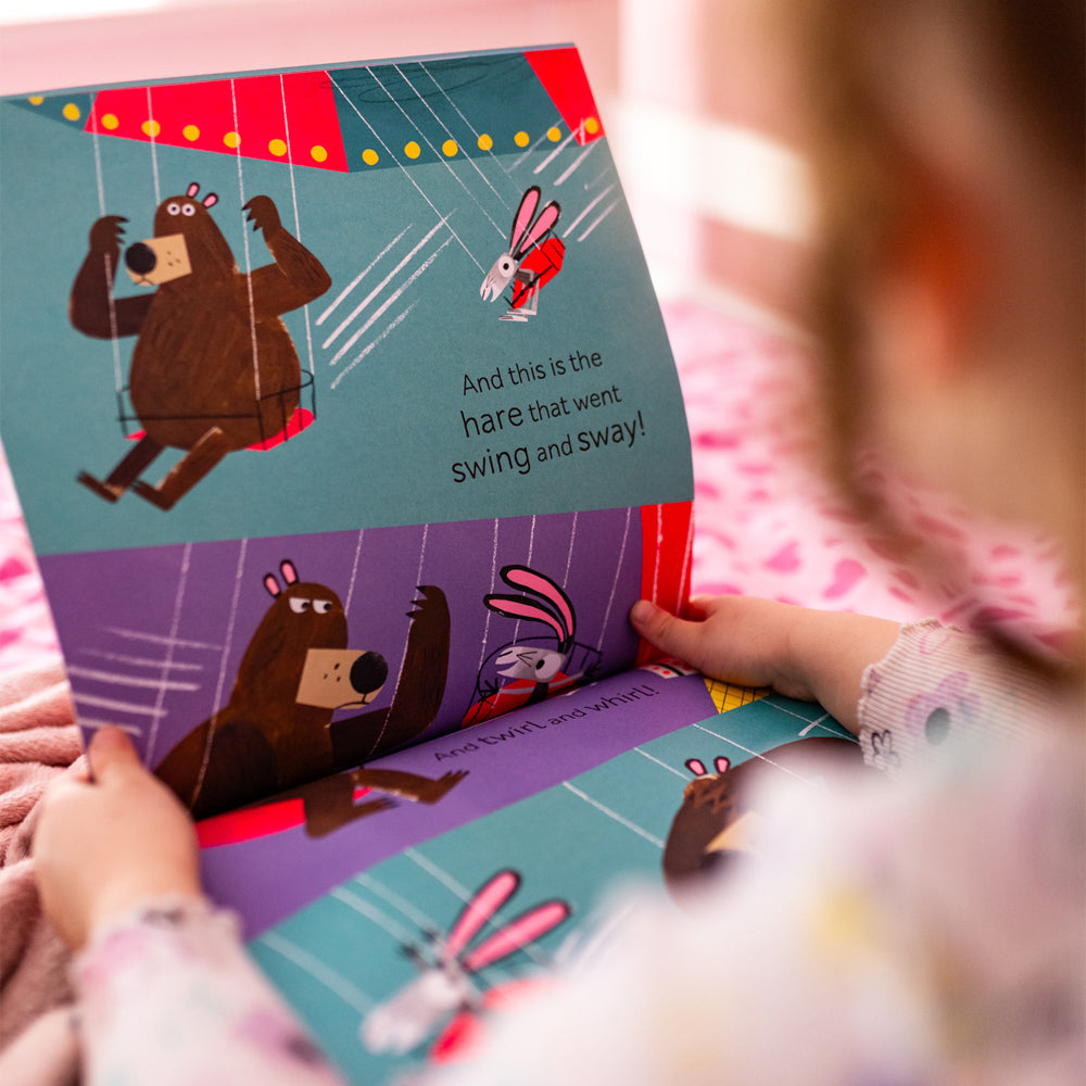 The Bear and the Hare and the Fair, lunaparkta bir arkadaşlık ve eğlence macerasını anlatan neşeli, kafiyeli ve renkli bir resimli kitap. Ayı ve Tavşan lunaparka gider — ama Ayı sallanan, dönen, zıplayan oyunları sevmez; Tavşan ise en çok bunlardan hoşlanır. İkisi de farklı şeylerden hoşlandığı için eğlence bulmakta zorlanır, ancak birlikte bir orta yol bulup hem eğlenmeyi hem de arkadaşlığı ön planda tutmayı öğrenirler.