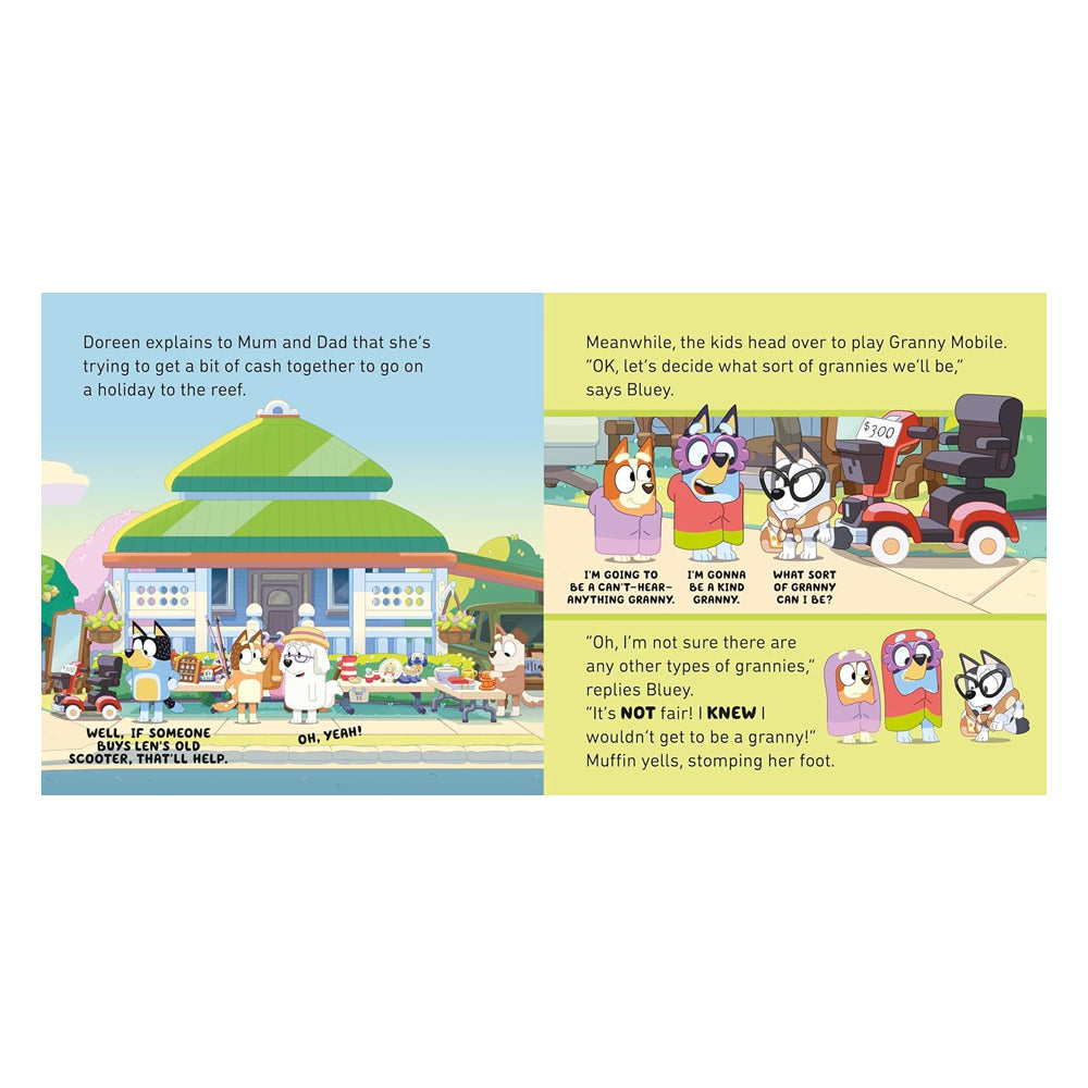 “Bluey: Granny Mobile” eğlenceli ve neşeli bir board-kitaptır. Bluey, Bingo ve Muffin, Doreen’in garaj satışında “Granny Mobile” oyunu oynamaya karar verirler. Muffin, huysuz bir büyükanne kılığına girer ve Bay Daddy’i eski bir engelli scooter’ı onun için süpürgeye çevirip itmesi için zorlar! O eğlenceli anlarda gerçek huysuz bir büyükanne de ortaya çıkınca işler iyice karışır… Kısa ve akıcı diliyle, küçük okurlar için yüksek sesle okunmaya çok uygun bir macera sunuyor.