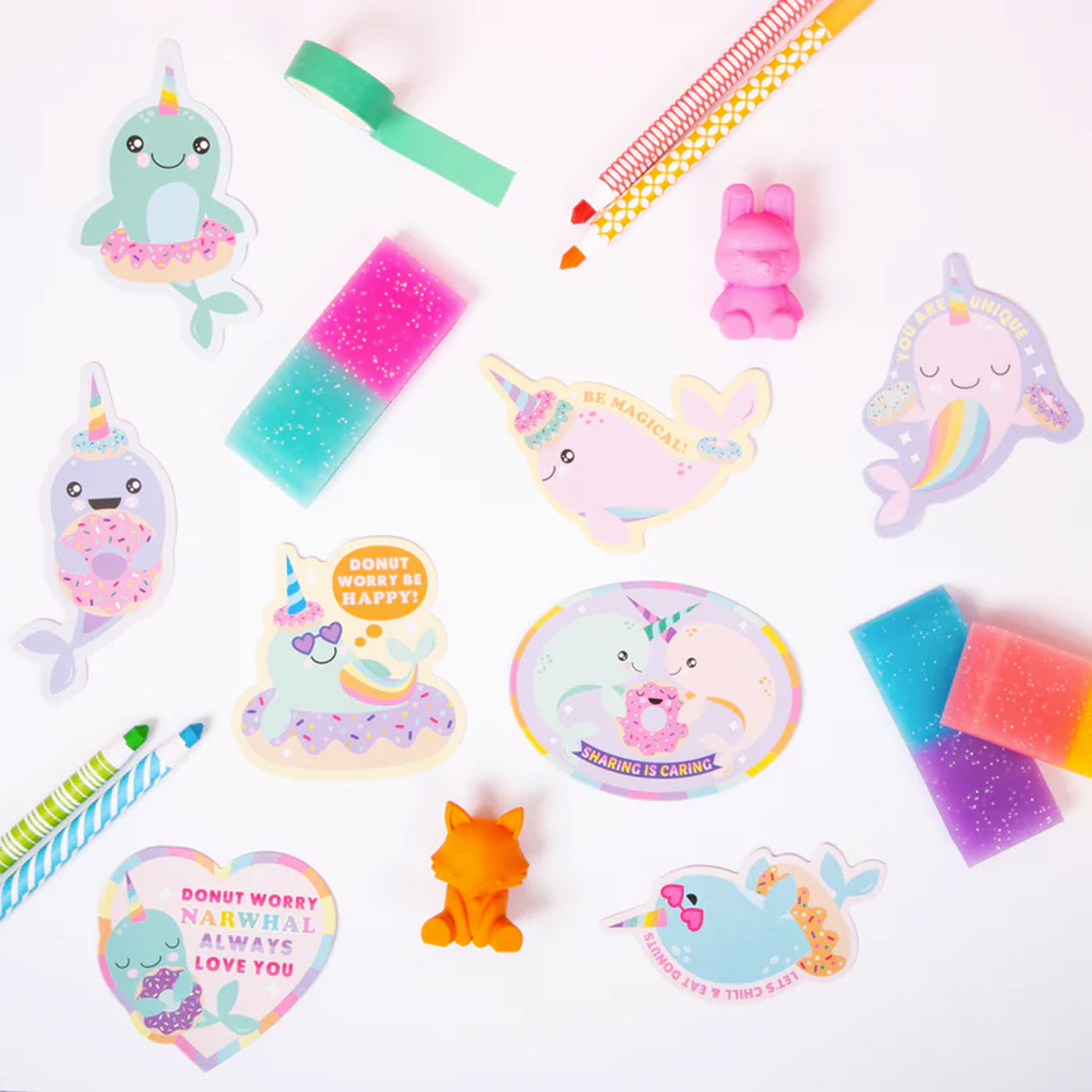 Narwhal ve donut çıkartmaları ile dünyanızı dekore edebilir ve aynı zamanda onları yapıştırdığınız yerlerin harika kokmasını sağlayabilirsiniz! İki yaprak üzerine yerleştirilmiş sekiz jumbo kalıp kesim çıkartmadan oluşan bu setle projelerinize, notlarınıza, resimlerinize ve kırtasiye malzemelerinize eğlenceli bir hava ve "tatlı kokular" katın. Çıkartmaların üzerinde parmak uçlarınızı gezdirdiğinizde, kokular açığa çıkar.
