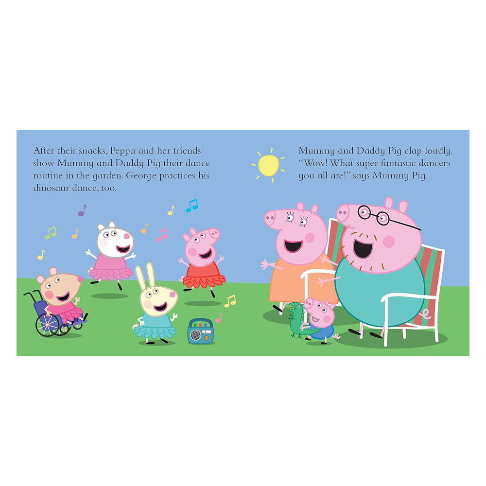 Peppa’s Peppa Goes Dancing, Peppa Pig’in dans etmeyi sevdiği neşeli bir günü anlattığı resimli bir kitap. Peppa, ailesi ve arkadaşlarıyla birlikte müzik eşliğinde dans eder, adım adım yeni figürler öğrenir ve eğlence dolu ritimlerin keyfini çıkarır. Bu hikâye çocuklara ritim, hareket ve birlikte eğlenmenin tadını öğretirken, kendilerini ifade etme duygusunu da destekler.