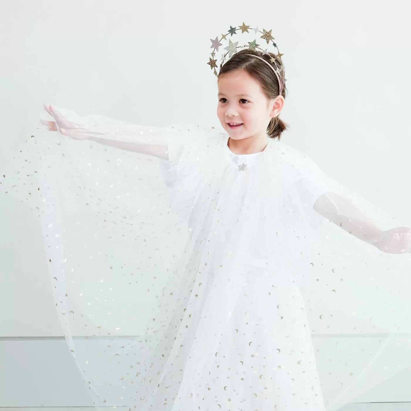 Metalik altın aylar ve yıldızlarla süslenmiş güzel beyaz tül katmanları