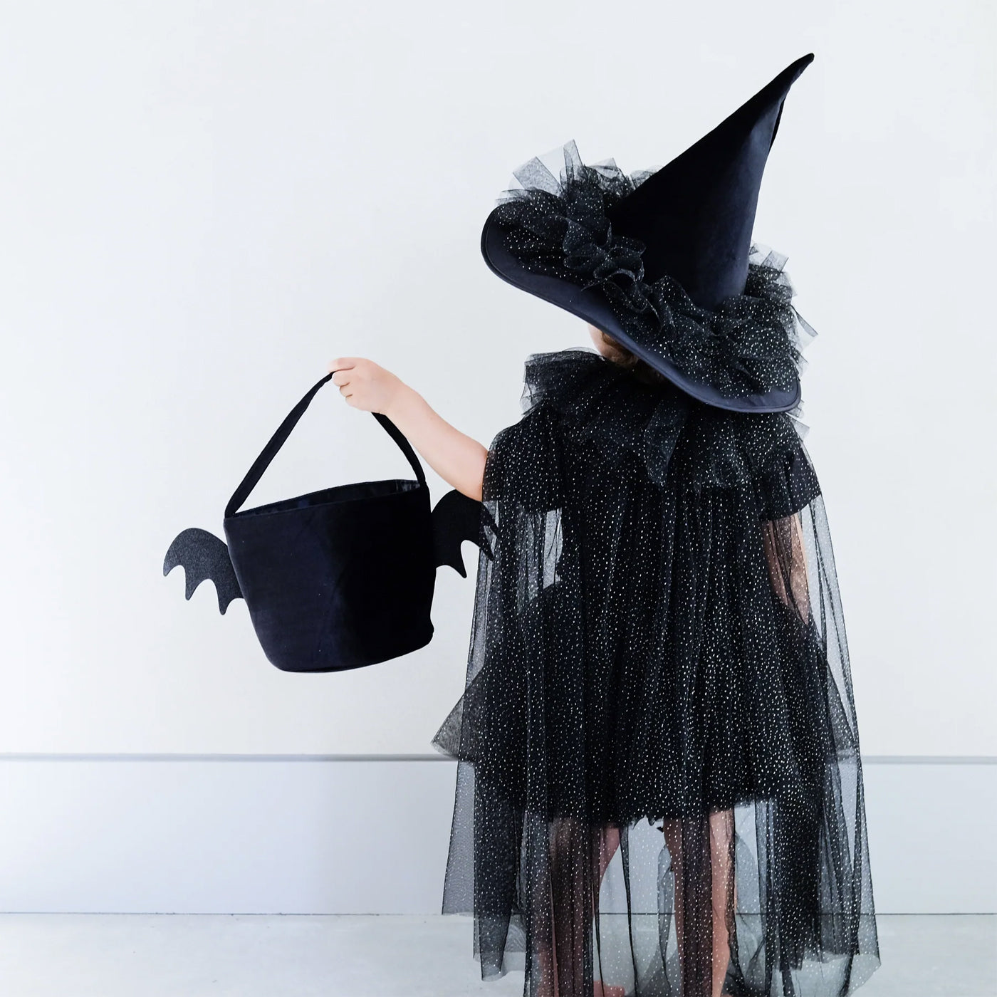 Cadılar Bayramı ikramlarını taşımak için harika bir çanta! Siyah kadife kumaş kaplı, siyah satenden kumaş astarlı, yumuşak süet kumaştan taşıma saplı, minik yarasa kanatlı bu çanta, kostümlere eşlik etmek için harika.