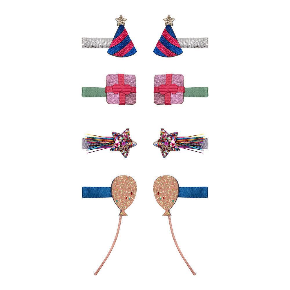 Mimi & Lula Birthday Party Mini 8'li Toka, yıldızlı parti şapkaları, simli balonlar, kayan yıldızlar ve kurdele kaplı hediyelerden oluşan neşeli bir set sunuyor. Her doğum günü kıyafetine ekstra mutluluk katmak için ideal.