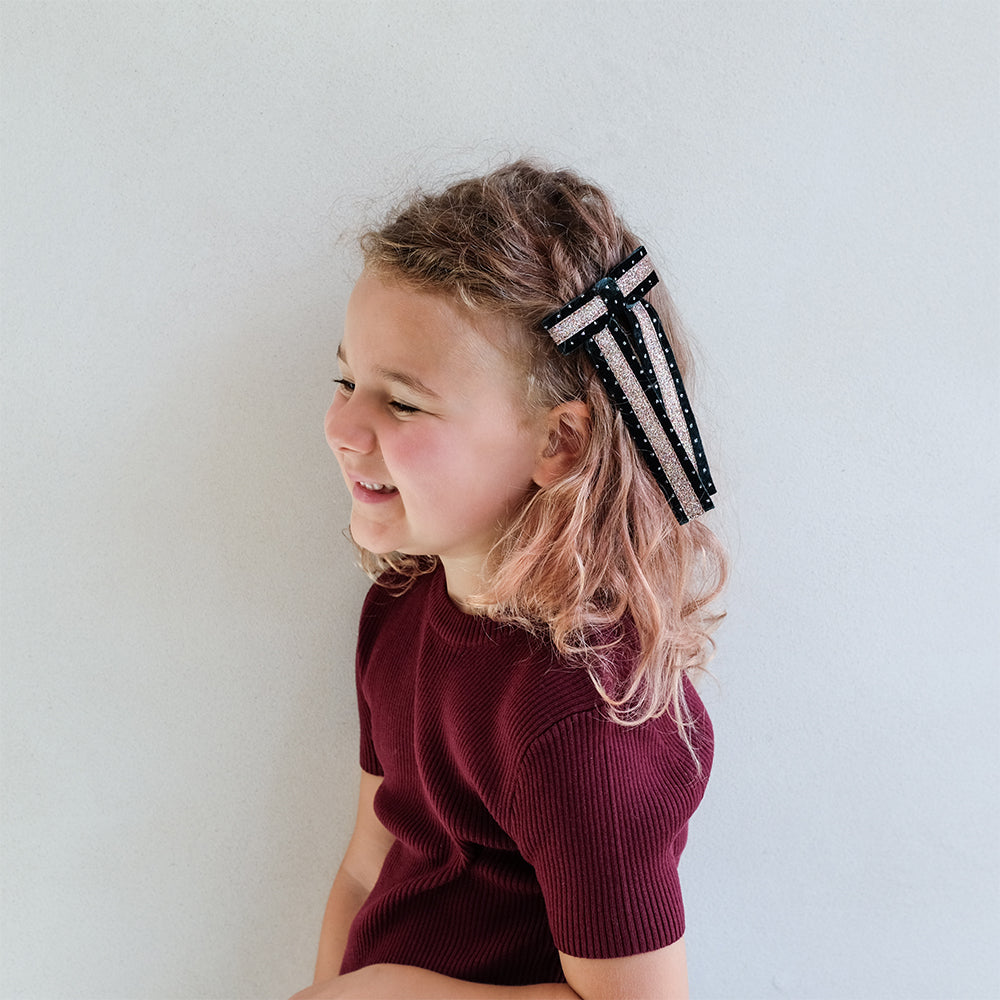 Mimi & Lula Circus Glitter Bow Toka - Green, derin yeşil kadife ve altın simle hazırlanmış sirk temalı gösterişli bir fiyonk. Uzun kuyruklu bu toka, at kuyruğu ya da yarım toplu saç modelleri için mükemmel bir seçimdir.