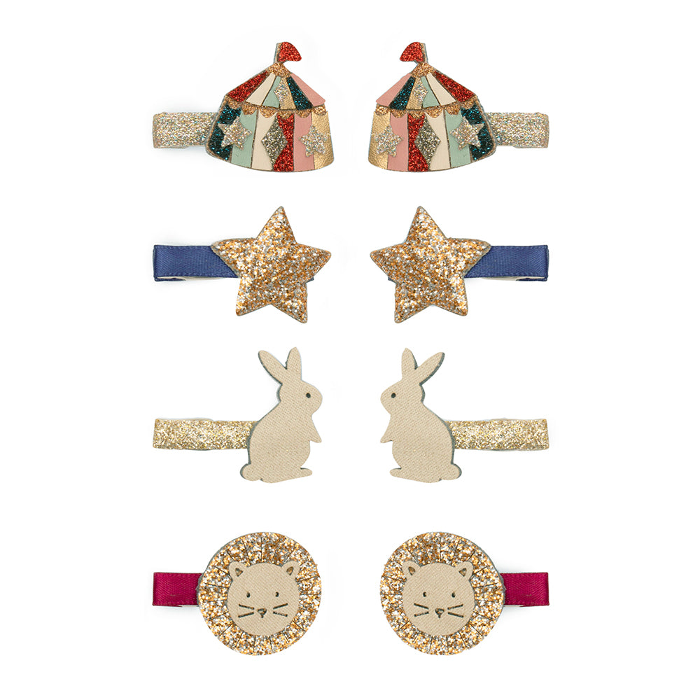 Mimi & Lula Circus Mini 8'li Toka, büyüleyici renk ve dokuların özenle bir araya getirildiği sirk temalı tokalar sunuyor. Aslanlar, sirk çadırları, tavşanlar ve yıldız figürleri, simli, metalik ve yumuşak süet kumaşlardan dikkat çekici bir şekilde tasarlanmıştır.
