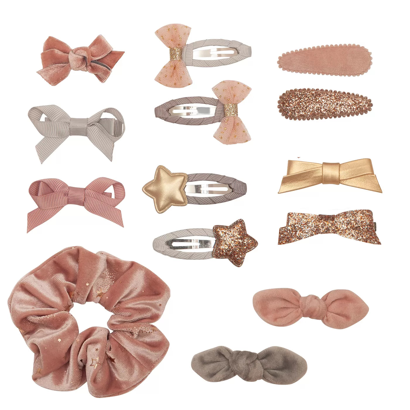 Çorap, yumuşak pembe, metalik ve nötr tonlarda bir kadife lastik toka ve 13 farklı saç tokası dahil olmak üzere 14 aksesuar içerir.