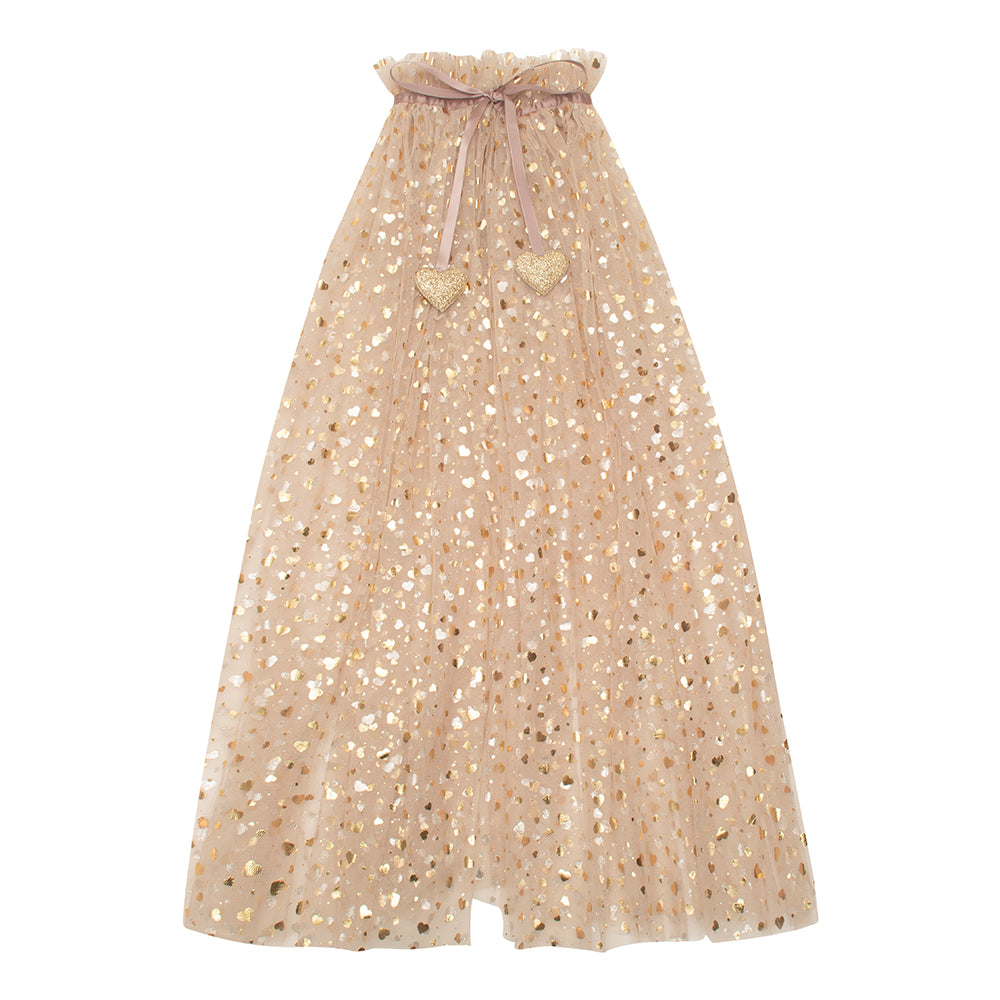Tatlı kalp desenli pelerin, partiler veya günlük oyunlar için mükemmel! Metalik altın kalplerle süslenmiş yumuşak tül katmanları. Saten kurdele ve altın simli kalp tılsımlarla çıtçıt düğme kapatma.