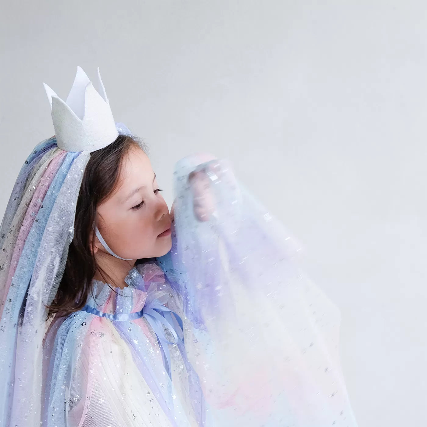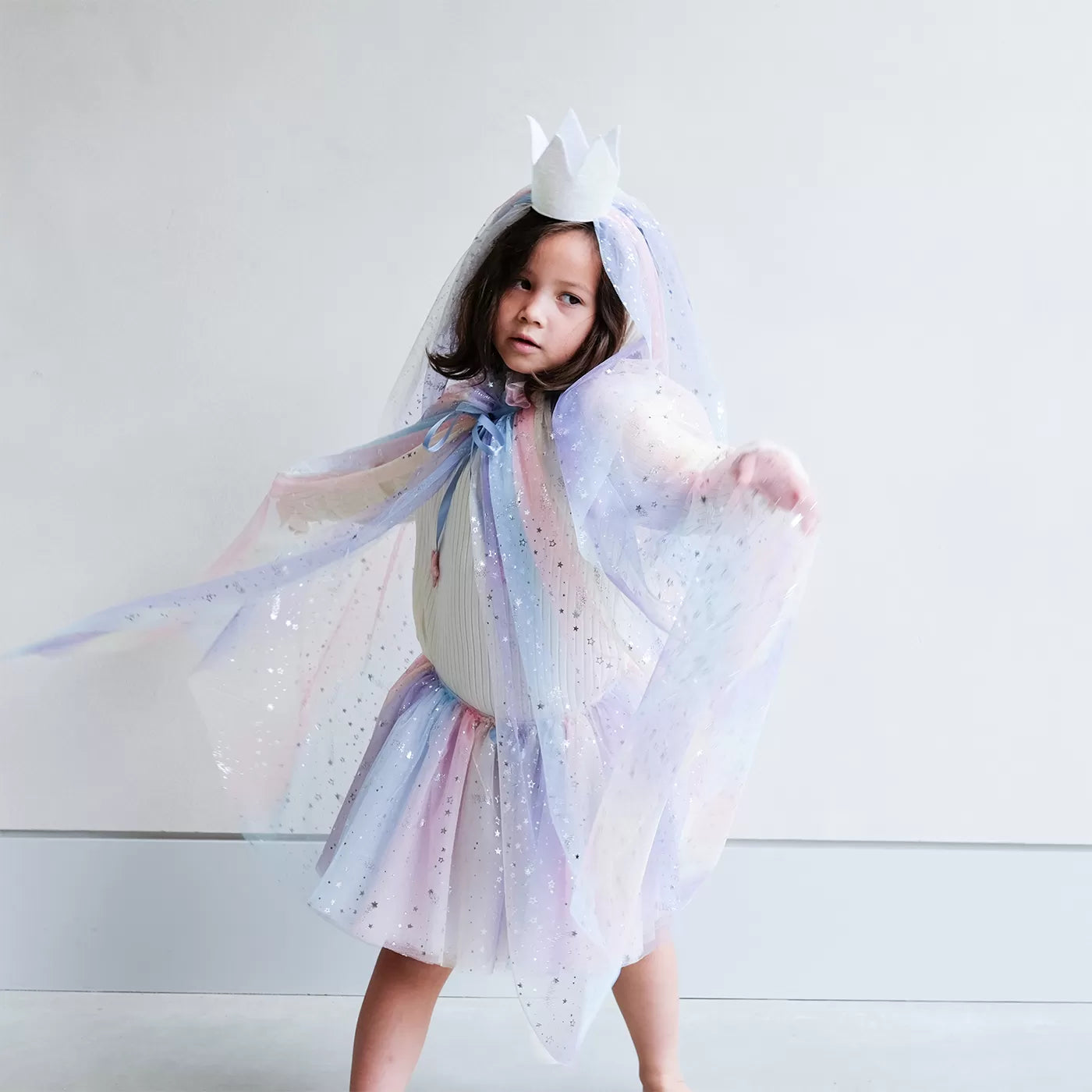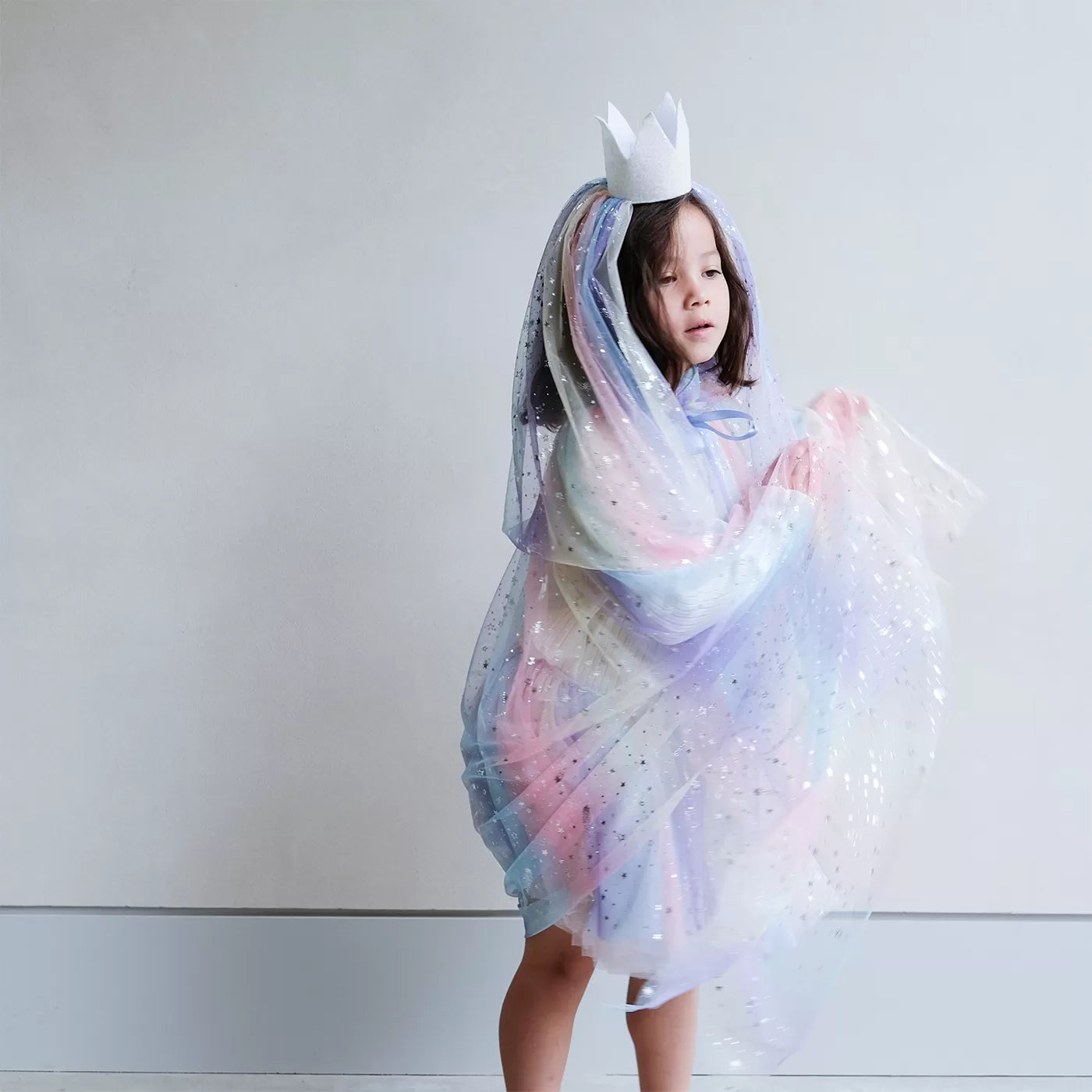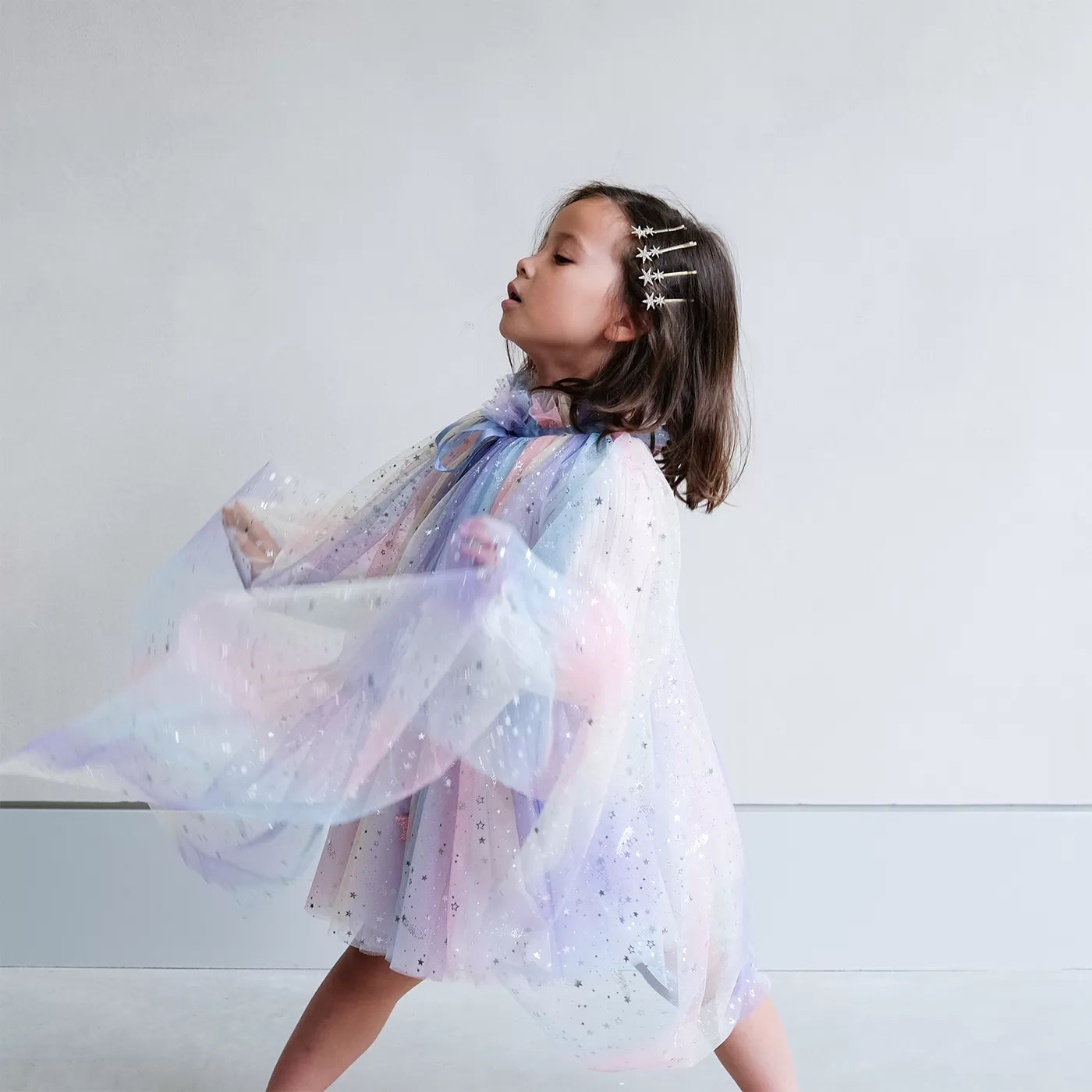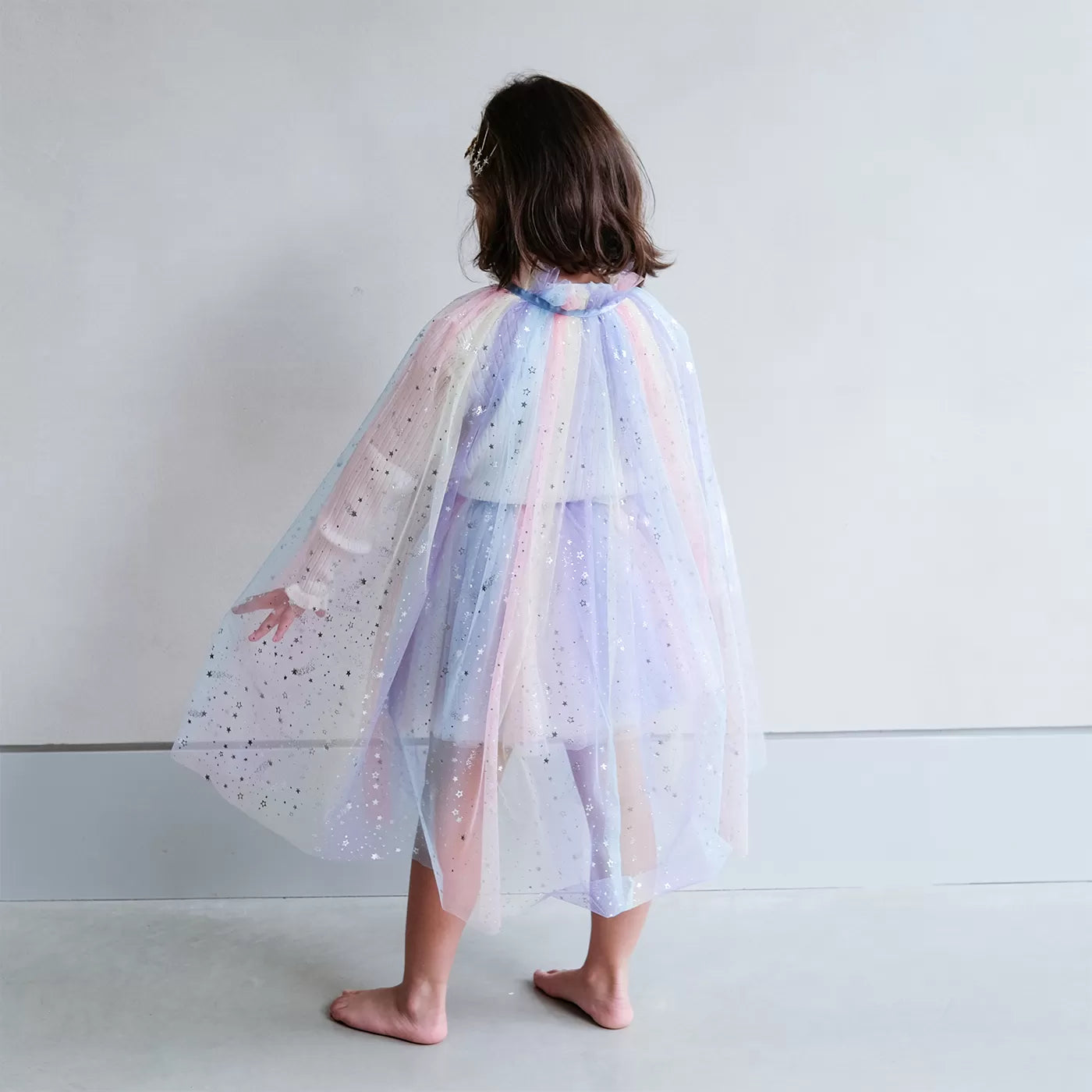 Metalik gümüş yıldızlarla süslenmiş pastel renkli gökkuşağı tül katmanları.