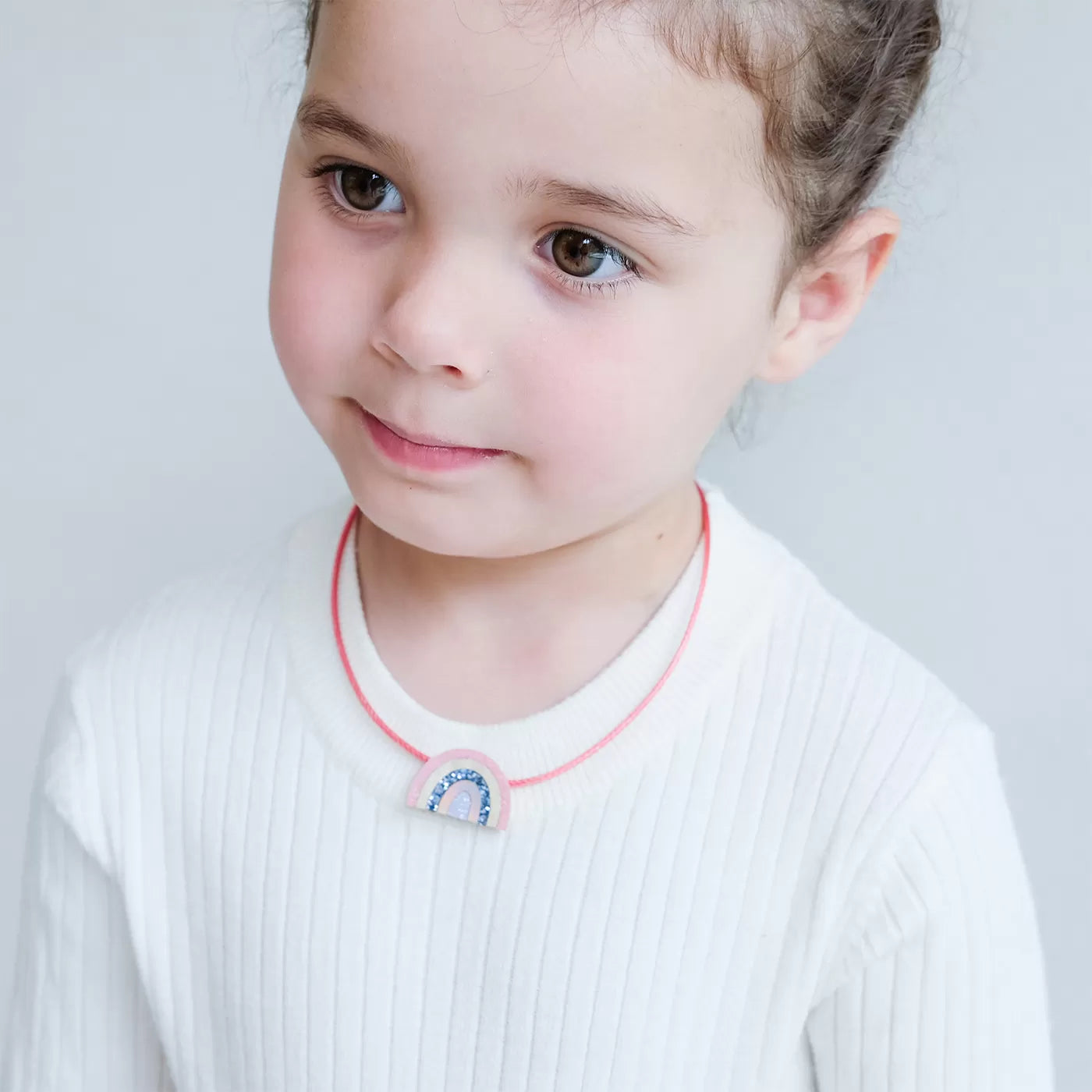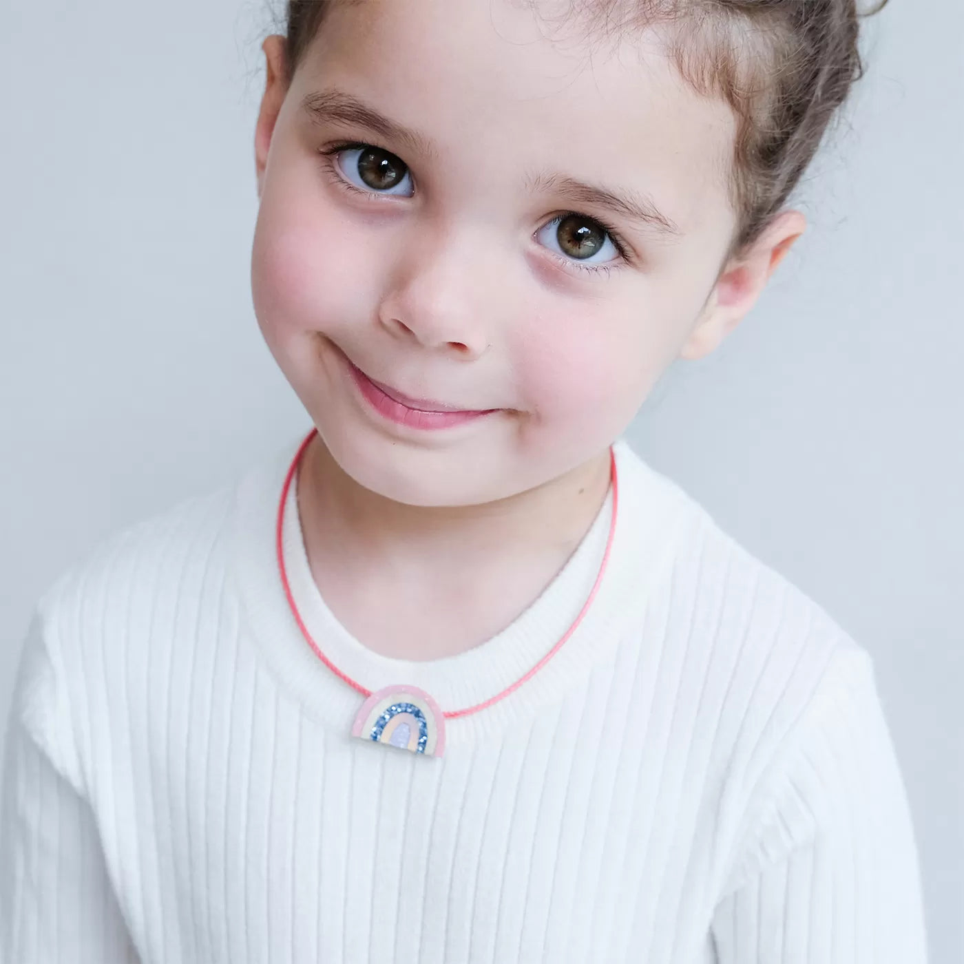Set; sim ve mat metalik yumuşak suni deri kumaşlardan özenle işlenmiş tatlı küçük gökkuşakları ve yıldızları olan bir kolye, bilezik ve bir yüzük içerir.