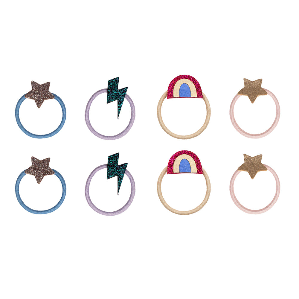 Mimi & Lula Rainbow Mini 8'li Lastik Toka, renkli gökkuşakları, ışıltılı yıldızlar ve şimşek figürleriyle dolu eğlenceli bir mini ponie seti sunuyor. Karıştırıp eşleştirerek sayısız neşeli stil yaratmak için mükemmeldir.