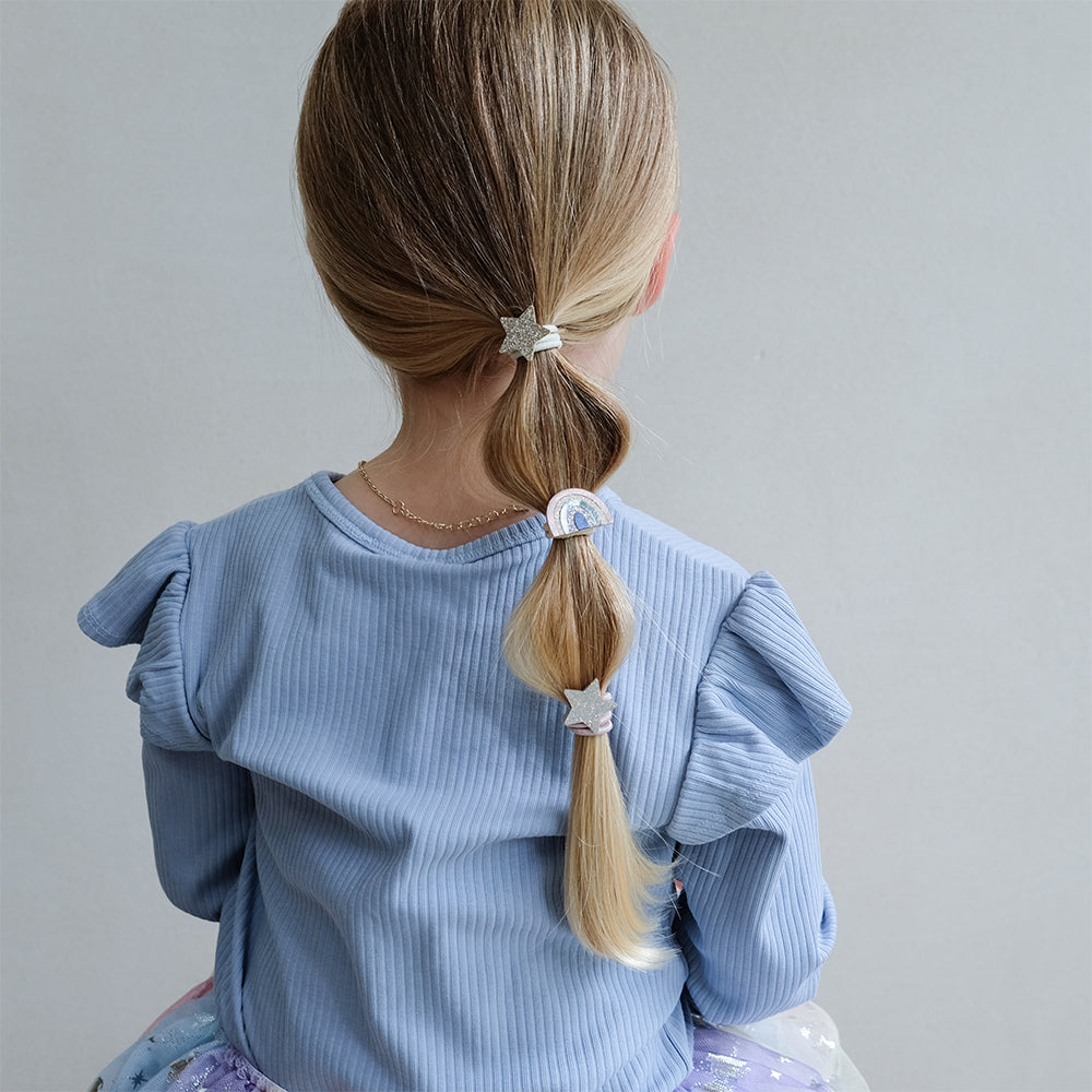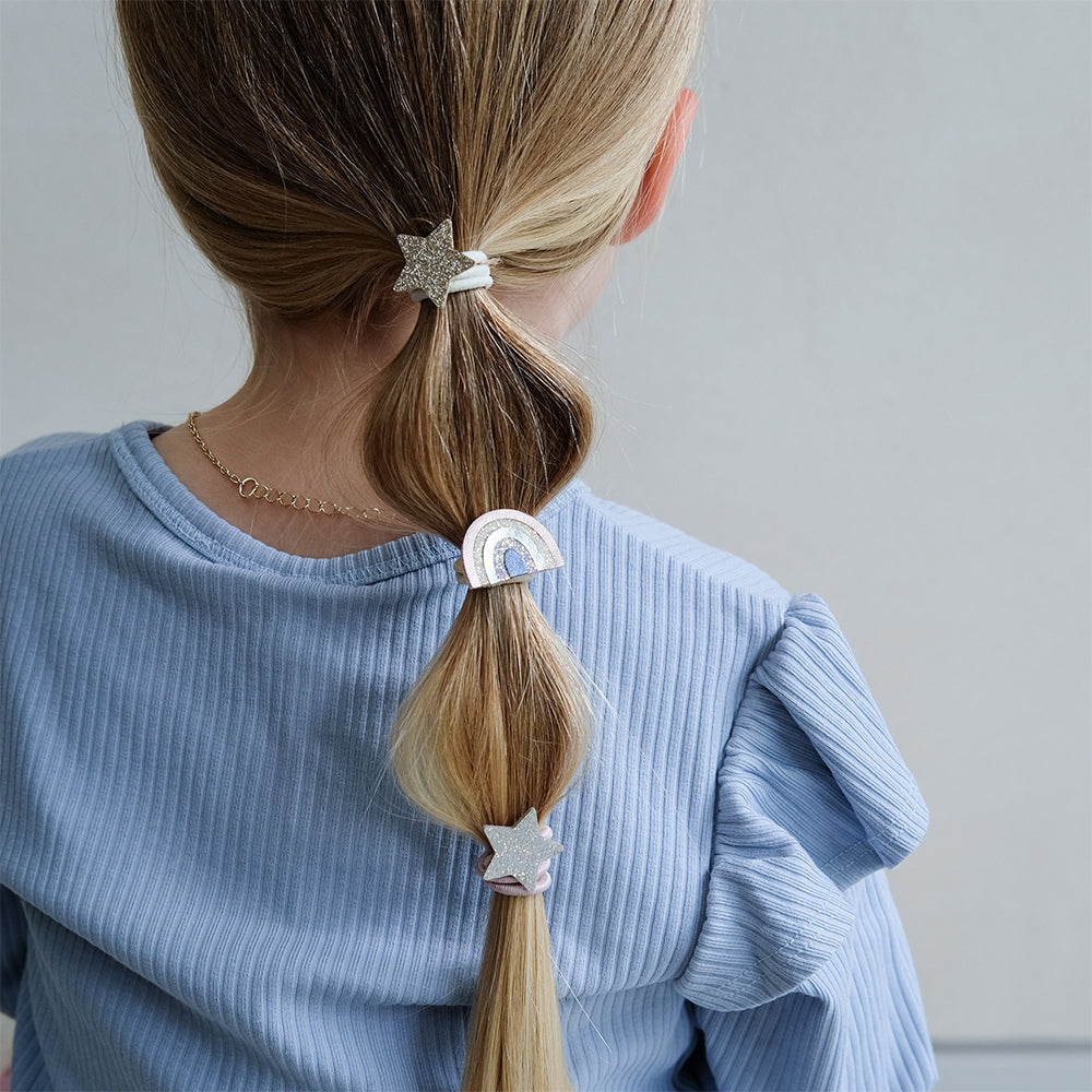 Mimi & Lula Rainbow & Star 6'lı Lastik Toka, dört ışıltılı yıldız ve iki parlak gökkuşağı figürüyle minik saçlara neşe ve parlaklık katıyor. Yumuşak metalik ve simli kumaşlardan özenle hazırlanmış bu lastik tokalar, hem güçlü hem esnek yapısıyla konforlu kullanım sağlar.