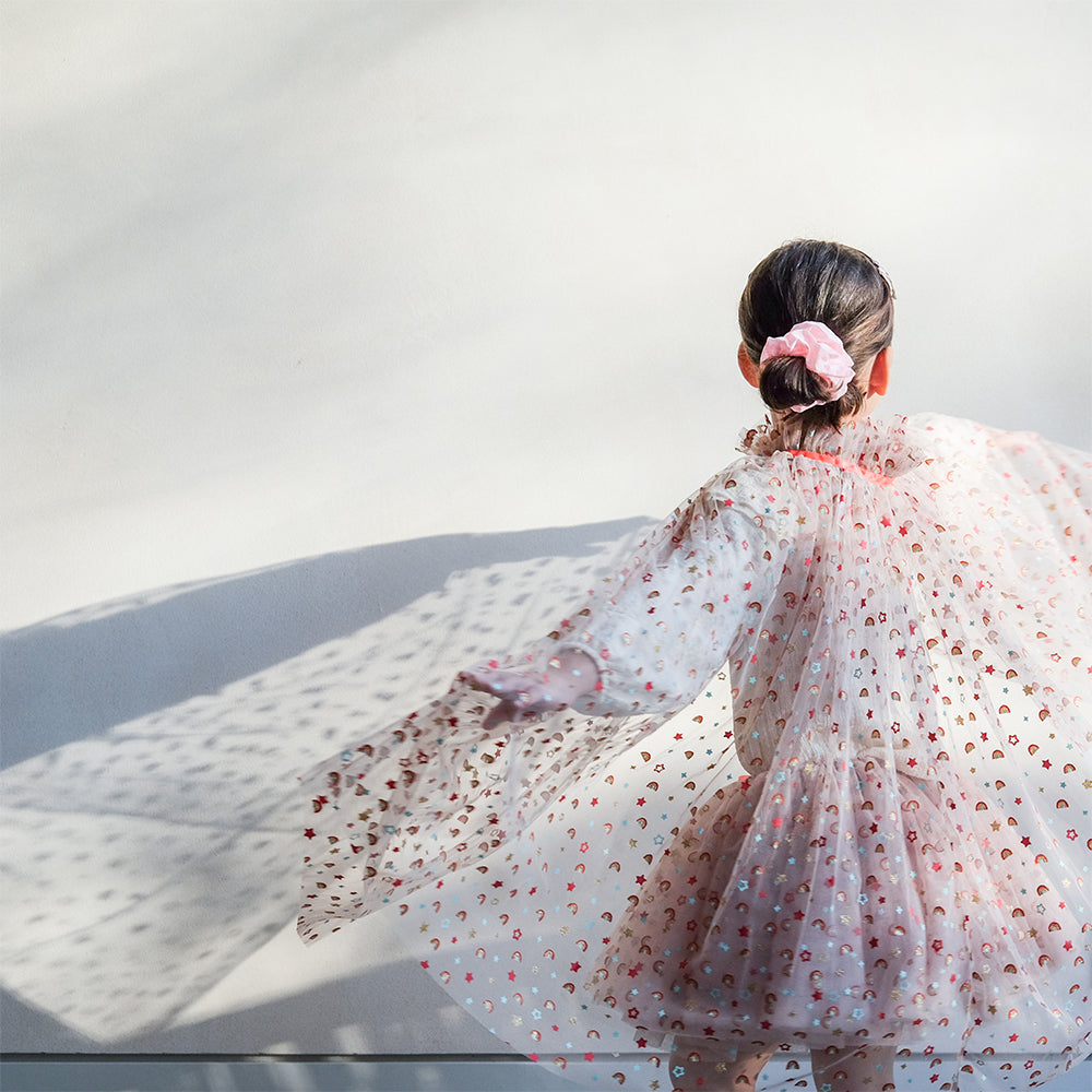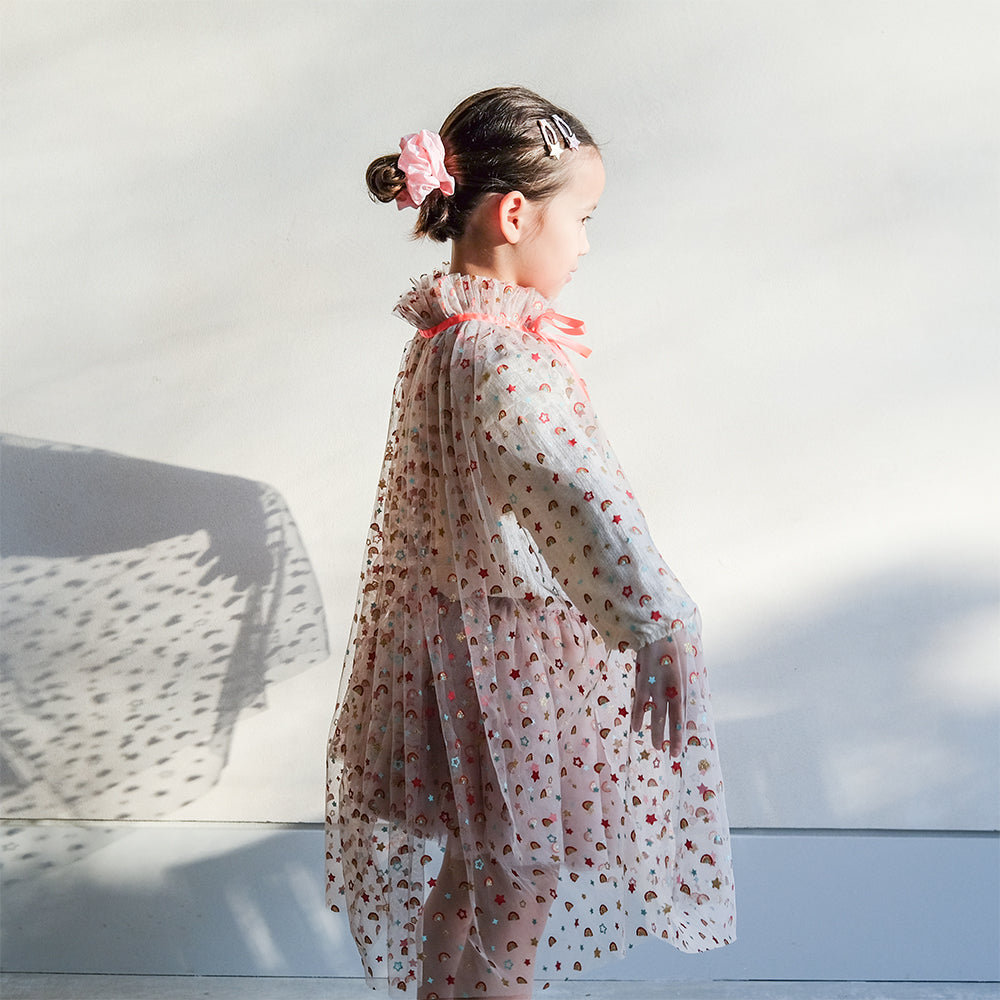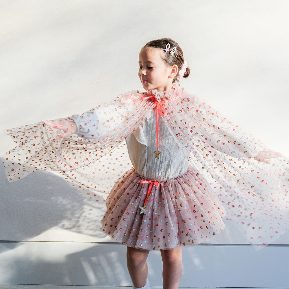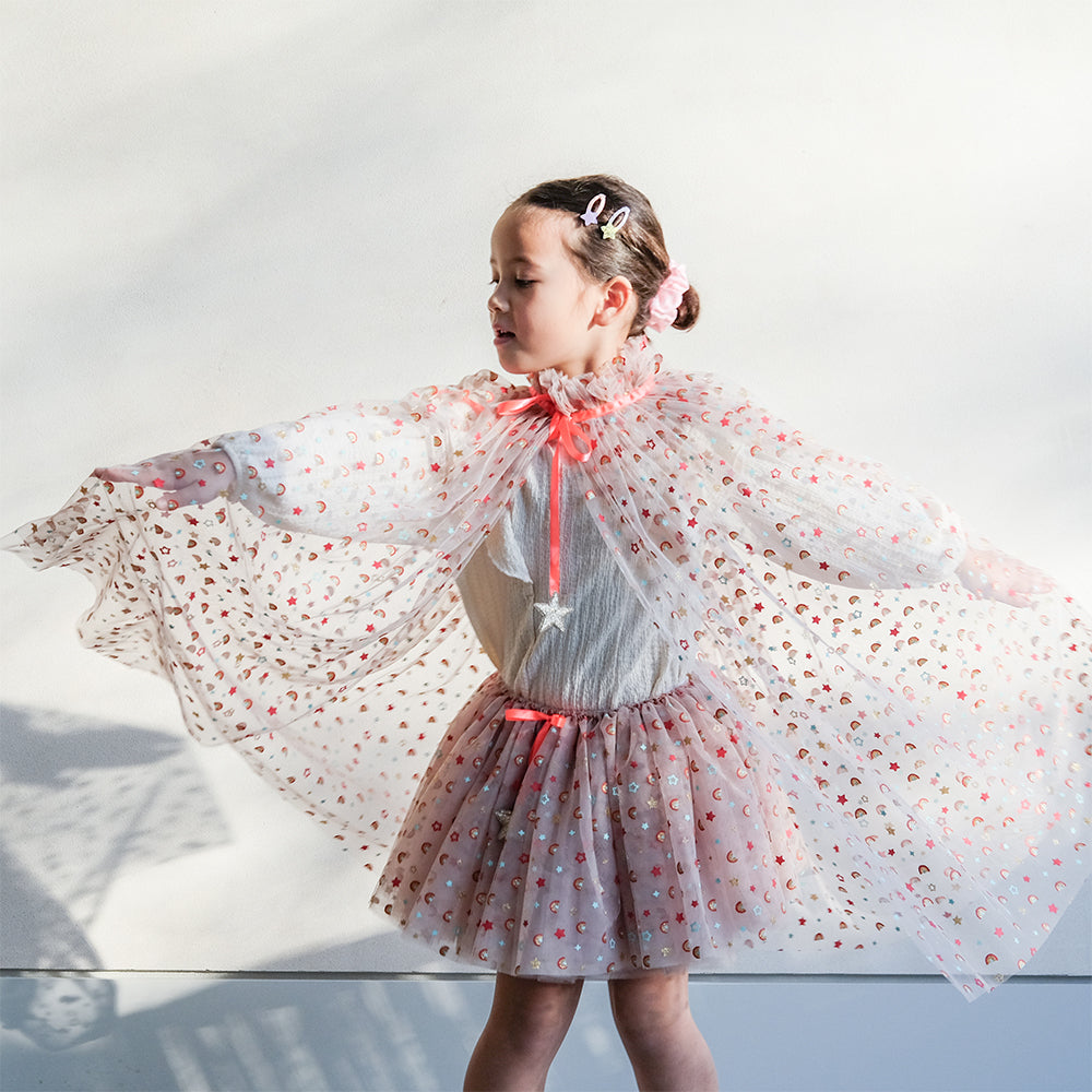 Parlak ve renkli Mimi & Lula Rainbow Tütü, partiler veya günlük oyunlar için mükemmel! Kırmızı, altın sim, nane renkli gökkuşağı ve yıldız baskılı tül katmanları. Yaklaşık 30 cm uzunluğundadır. Saten kurdele fiyonk ve altın simli yıldız tılsımlar.