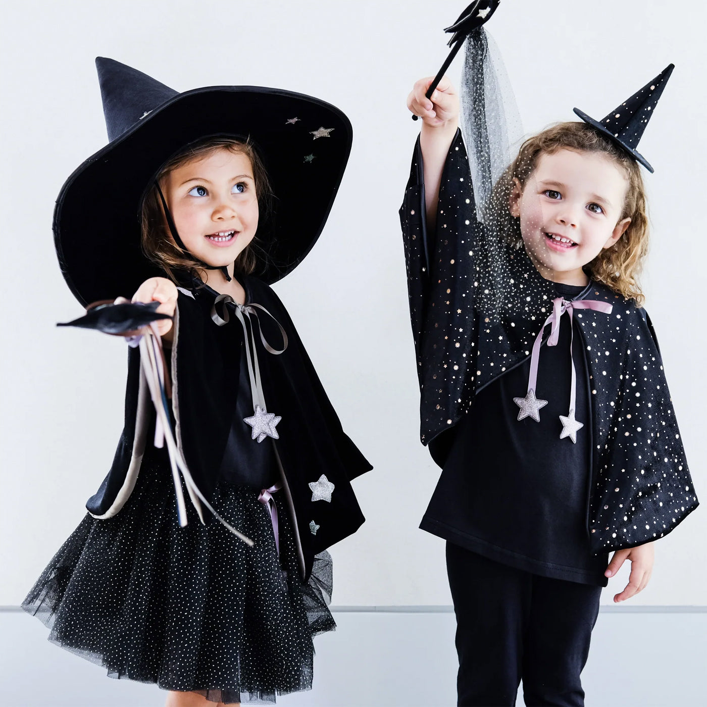 Mini cadı şapkası ile bu yıl kostümünüze biraz cadı sihri katın! Herhangi bir Cadılar Bayramı kıyafetine mükemmel bir katkı sağlayan, grogren kurdele kaplı, altın folyo yıldızlarla süslenmiş siyah kadife kumaştan yapılan bu taç, hem kolay giyiliyor hem de düşmeden rahatça durabiliyor.