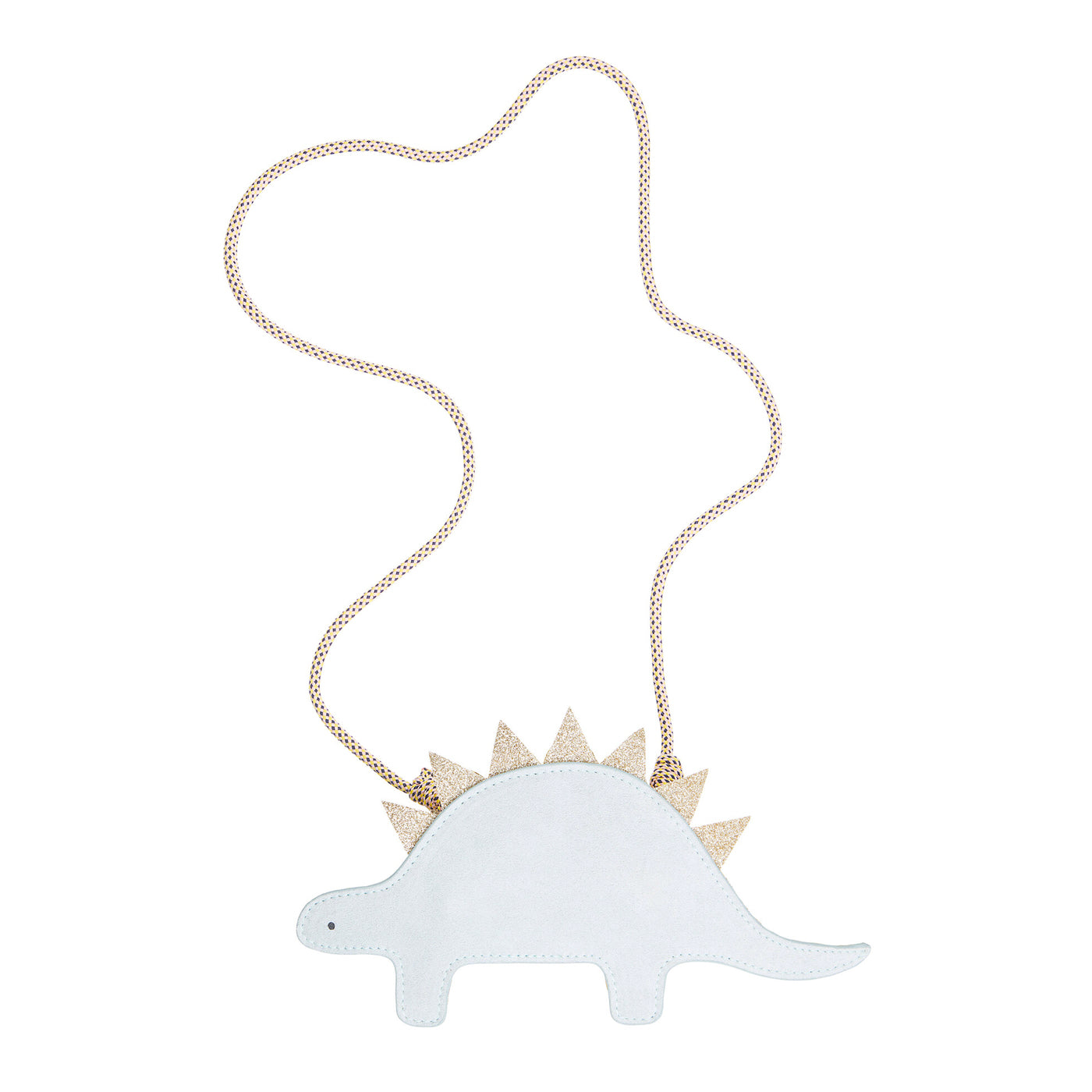 Stegosaurus desenli çapraz çantayla kükremeye hazır olun! Yumuşak, uçuk mavi süet kumaştan yapılan, süper ışıltılı altın dikenlere, havalı ve renkli elastik kordon kayışa ve fermuarlı cebe sahip olan bu dinozor çantası, havalı bir görünüm için kesinlikle ideal!