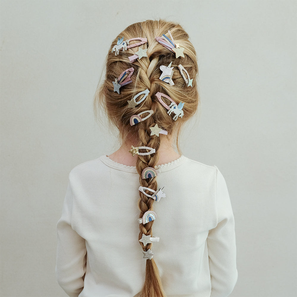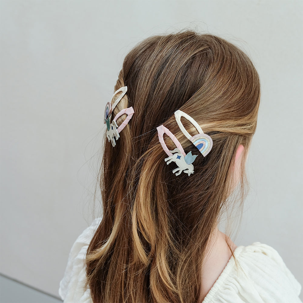 Mimi & Lula Winged Unicorn & Rainbow 4'lü Toka, kanatlı unicornlar ve sevimli gökkuşaklarıyla saçlara efsanevi bir büyü katıyor. Yumuşak metalik ve ince sim kumaşlardan özenle hazırlanmış bu tokalar, küçüklerin favorisi olacak.