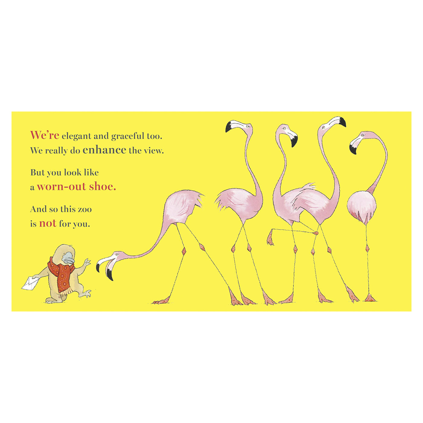 Ödüllü yazar ve illüstratör Ross Collins'in bu kitabı hoşgörü, kabullenme ve nezaketin önemi hakkında kafiyeli metinlere ve komik bir anlatıma sahip. Küçük, arkadaş canlısı bir ornitorenk hayvanat bahçesine geldiğinde, diğer hayvanlar onu çeşitli sebepler yüzünden aralarında kabul etmek istemezler. O da geri döner. Tam diğer hayvanlar ona olan davranışlarından pişman olmuşken geride ornitorenk tarafından onlara bırakılan bir davetiye görürler! Aslında o, hepsini partisine davet etmek için hayvanat bahçesine gelmiştir!