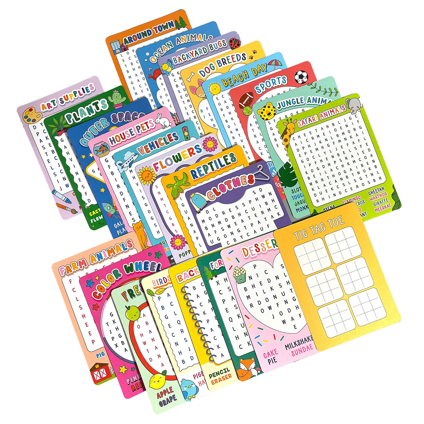 Kelime arama oyunu, ister evde isterseniz hareket halindeyken yapılabilecek harika bir aktivitedir. 24 kolay bulmacadan oluşan ve öğrenmeyi de destekleyen bu setteki her aktivite kartı, çocukların arama yapmasını sağlayacak farklı bir temaya sahip. Set, her biri okula dönüş, kahvaltı yiyecekleri ve meyve gibi farklı bir temayı içeren 24 bulmaca içeriyor. Ayrıca her etkinlik kartının arkasında bir tic-tac-toe oyunu yer alıyor.