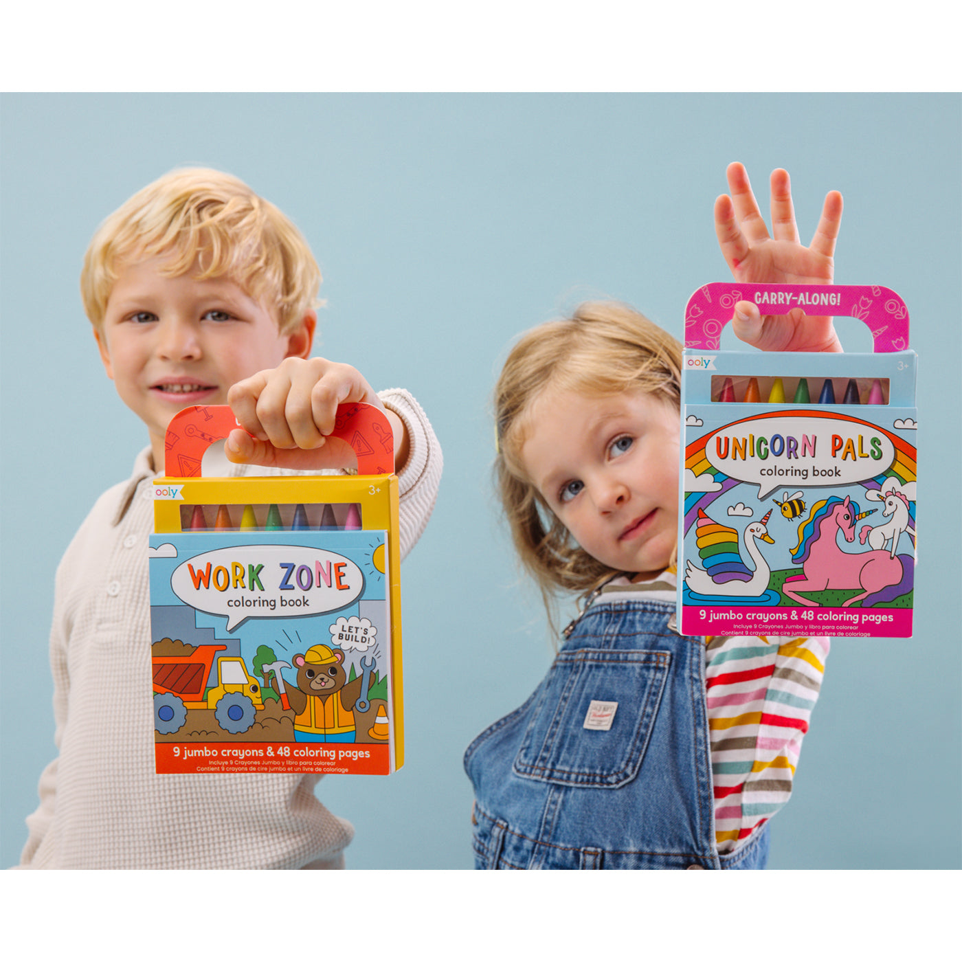 9 jumbo boya kalemi ve 48 inşaat temalı boyama sayfasıyla bu seyahat boyu boyama seti, siz hareket halindeyken küçük çocuğunuzu meşgul etmek için mükemmel!
