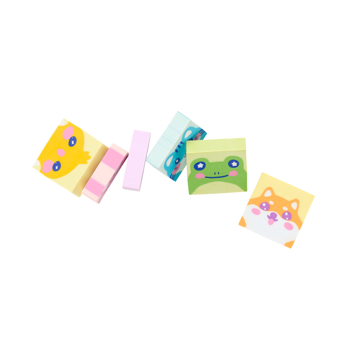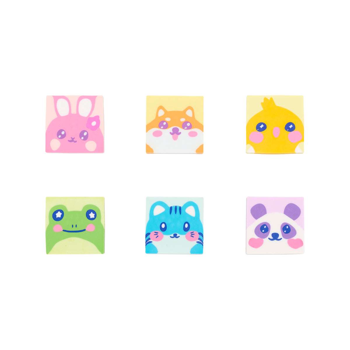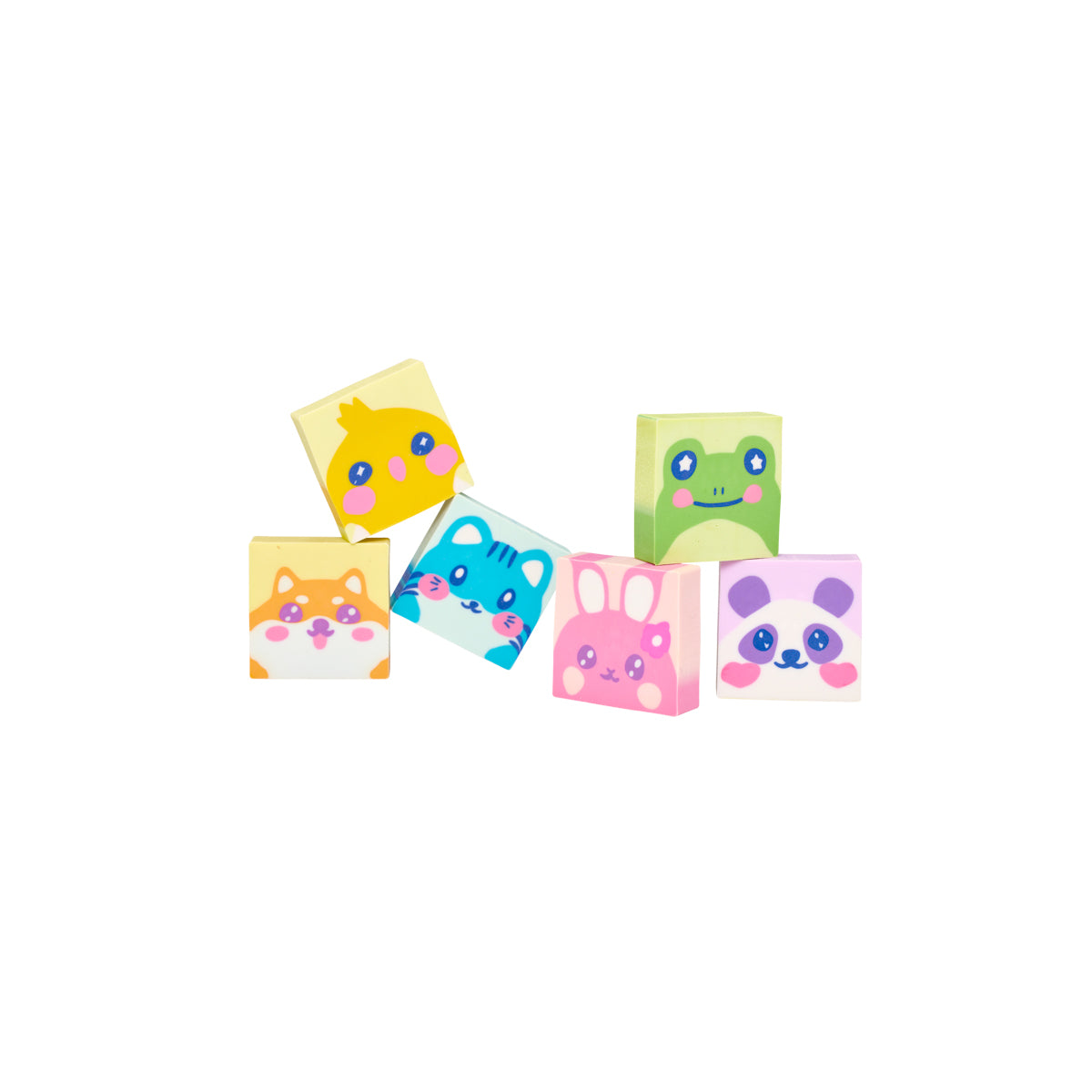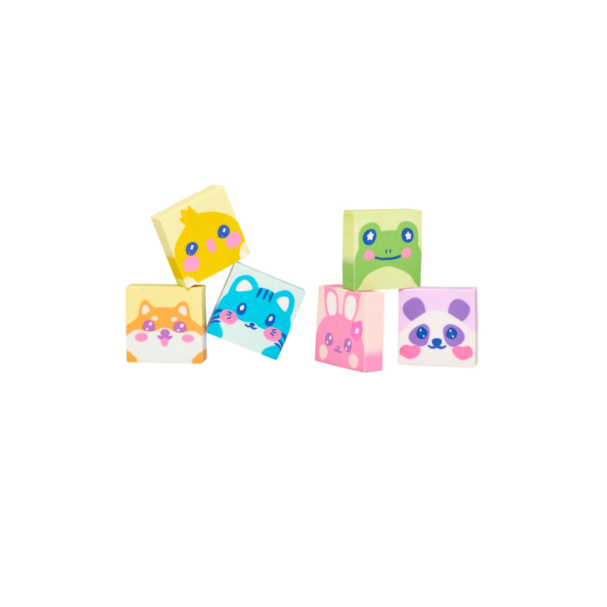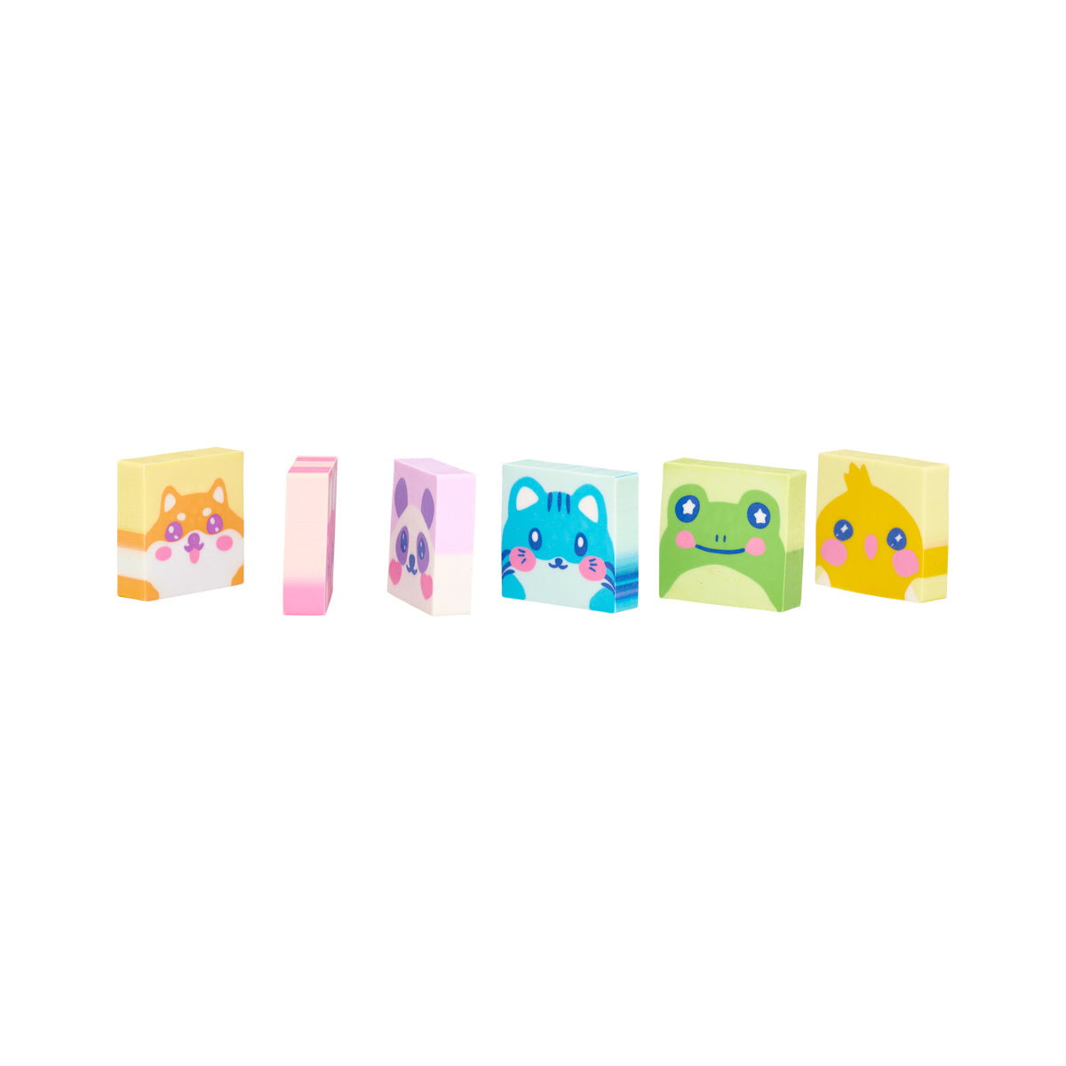 Pembe tavşan, arkadaş canlısı tilki, sevimli civciv, yeşil kurbağa, kedi yavrusu ve mor panda gibi renkli ve sevimli yaratıklardan oluşan silgi seti okul ödevlerini eğlenceli hale getiriyor! Ayrıca her sevimli silgi, lezzetli bir meyve kokusuna sahip.