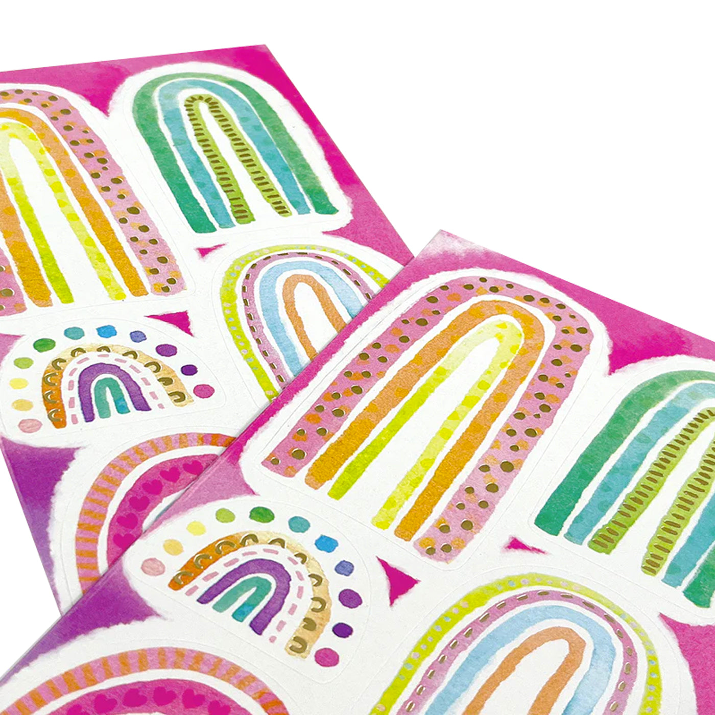 Gökkuşağı çıkartma sayfaları, metalik folyo ile tasarlanmıştır her biri havalı sulu boya görünümüne sahiptir. İki çıkartma sayfası, farklı boyutlarda gökkuşakları içerir.