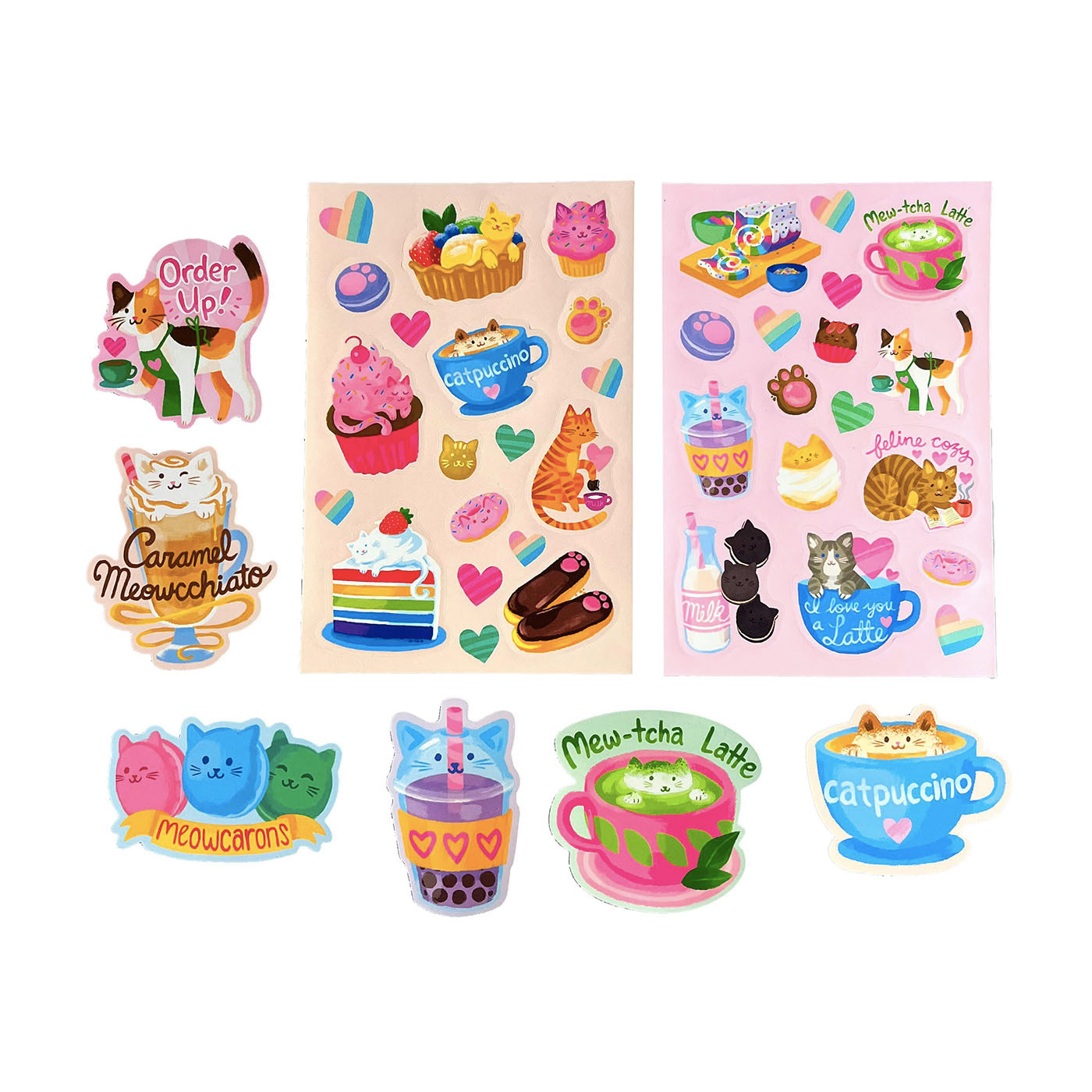 Çıkartmalar tatlılar, kahve ve içecek çıkartmaları içeren bir kedi kafesi temasına sahiptir