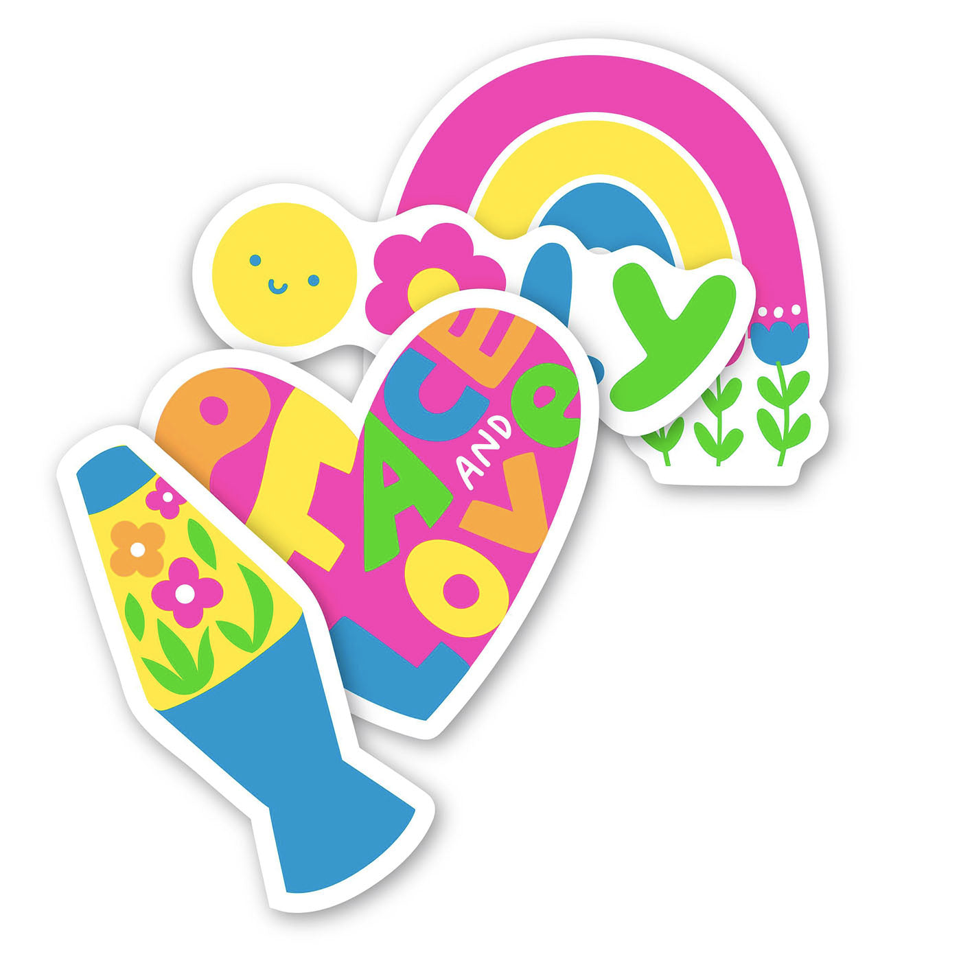Dört vinil çıkartmadan oluşan bu set, çiçeklerin gücünü dilediğiniz yere taşımanızı sağlıyor. Her tasarım sizi 70'lerin cool havasına geri götürüyor. Neon renk paletleri ile canlı ve şık bir görünüme sahip olan bu su geçirmez çıkartmalar, zamana meydan okuyan mesajları ile şişeler, defterler, kitaplar gibi gibi günlük eşyalara çok yakışacak.