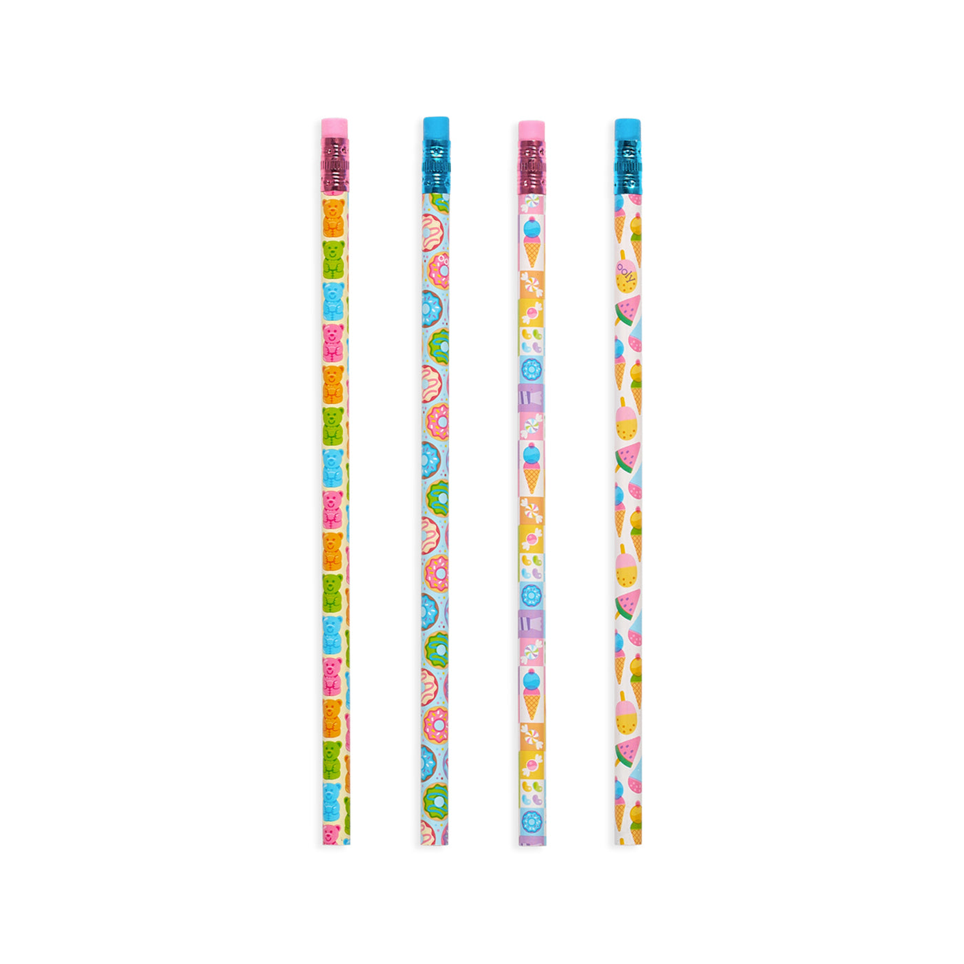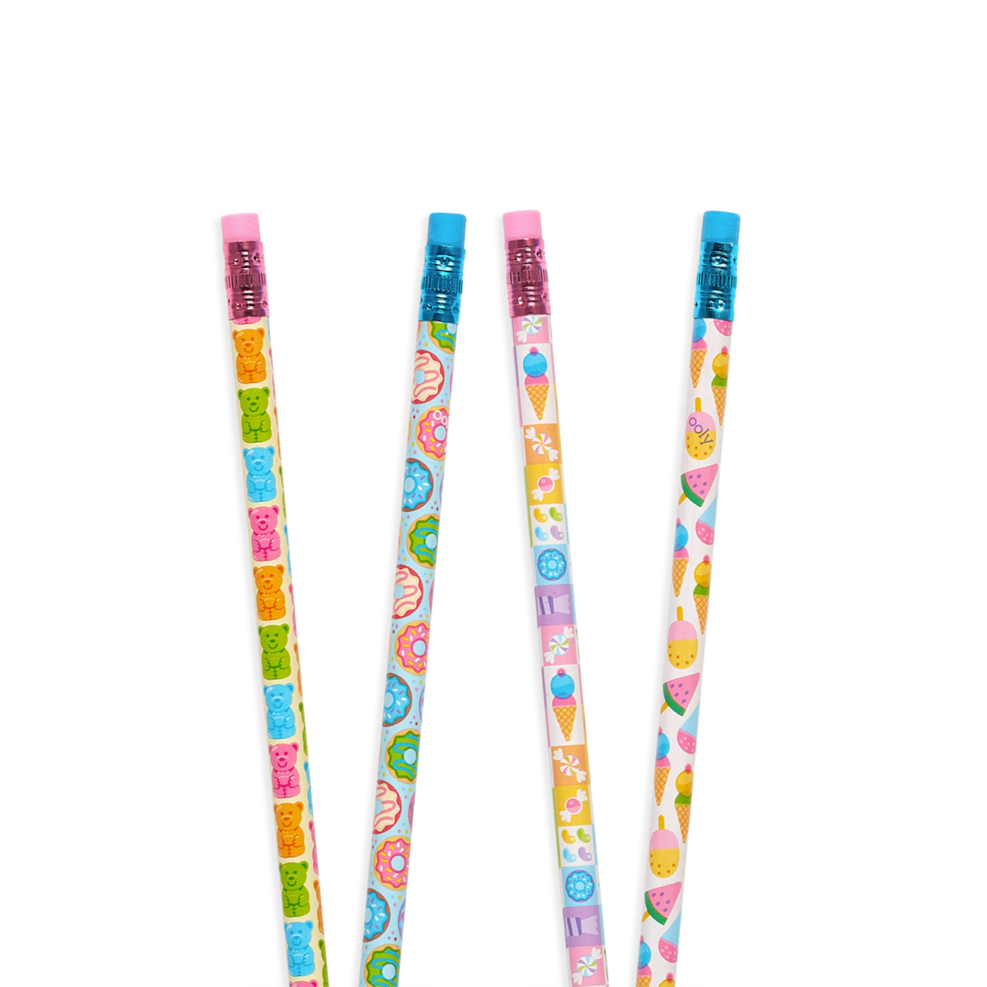 Dondurmalar, şekerlemeler, sakızlar bu 2 numaralı kurşun kalem setinin gövdelerini süslüyor. 12 kalemden oluşan bu setin her kaleminin ucunda yazım hatalarını düzeltmek için bir silgi bulunuyor.