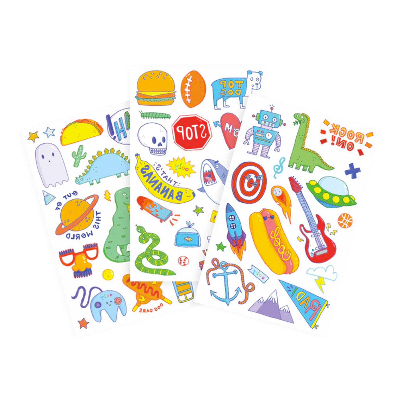 Bu harika geçici dövmeler ile yaratıcılığınızı ve tarzınızı konuşturun. 3 sayfa geçici dövme setinde toplamda 50'den fazla dövme var! Bu dövme seti, köpekbalıkları, dinozorlar ve güneş gözlüklü bir sosisli sandviç gibi harika şeylerle dolu. Toksik madde içermeyen geçici dövmelerin uygulanması ve çıkarılması son derece kolaydır. 5 güne kadar dayanabilir. (Yetişkin gözetiminde uygulanması önerilir.)