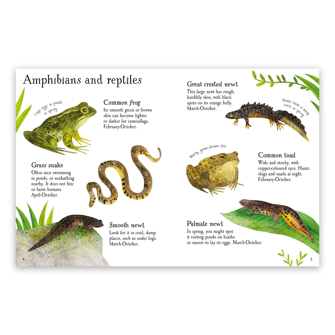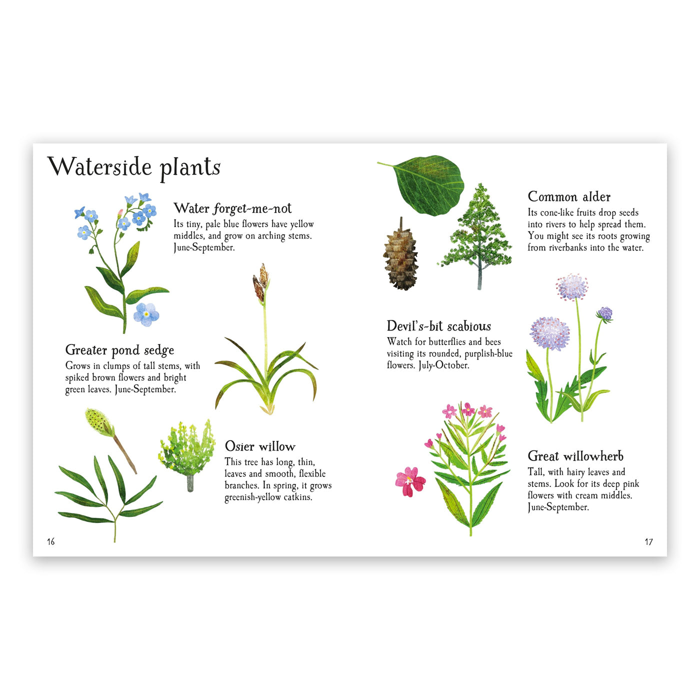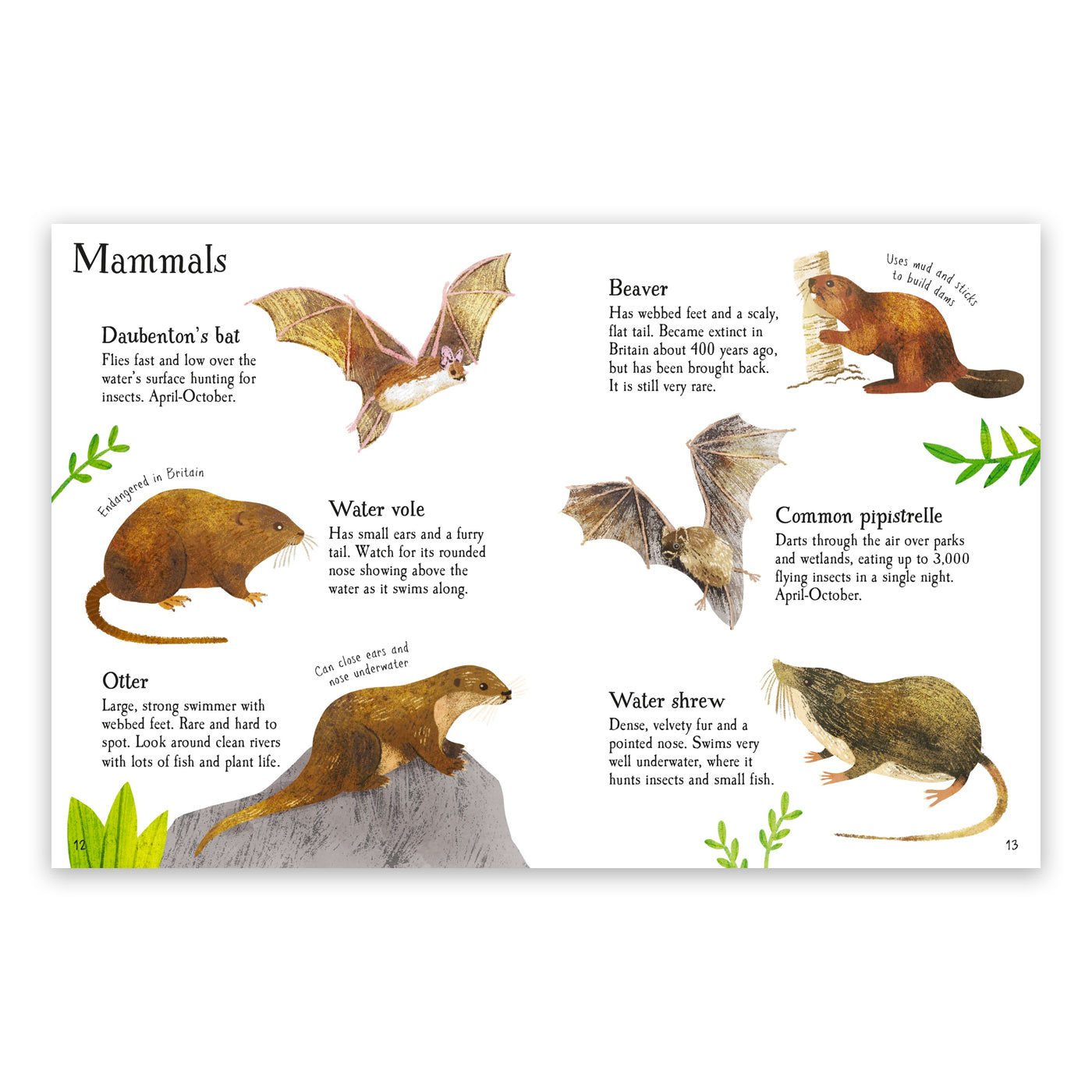 Çocuklar göletler, nehirler ve kanalların yakınında yaşayan farklı bitki ve hayvanları tanımlayan bu küçük kitapla sulu dünyaları keşfetmenin keyfini çıkarabilirler. 60 çeşit hayvan, böcek, ağaç ve bitki, faydalı bir açıklama, göz alıcı bir illüstrasyon ve her biri için bir çıkartma ile türlerine göre gruplandırılmıştır. Kitabın arkasında bir çizelge ve çıkartmalar yer alıyor, böylece gördükleri şeyleri takip edebiliyorlar.