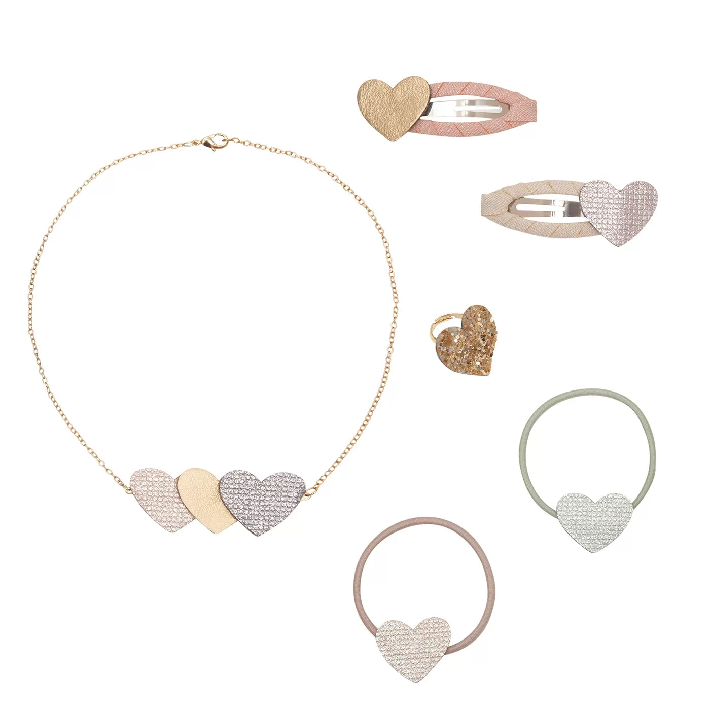 Parıldayan bir kalp kolye ve yüzük ile uyumlu saç aksesuarlarıyla dolu olan bu güzel sürprizli paket, harika bir yılbaşı için hediyesi seçeneği.