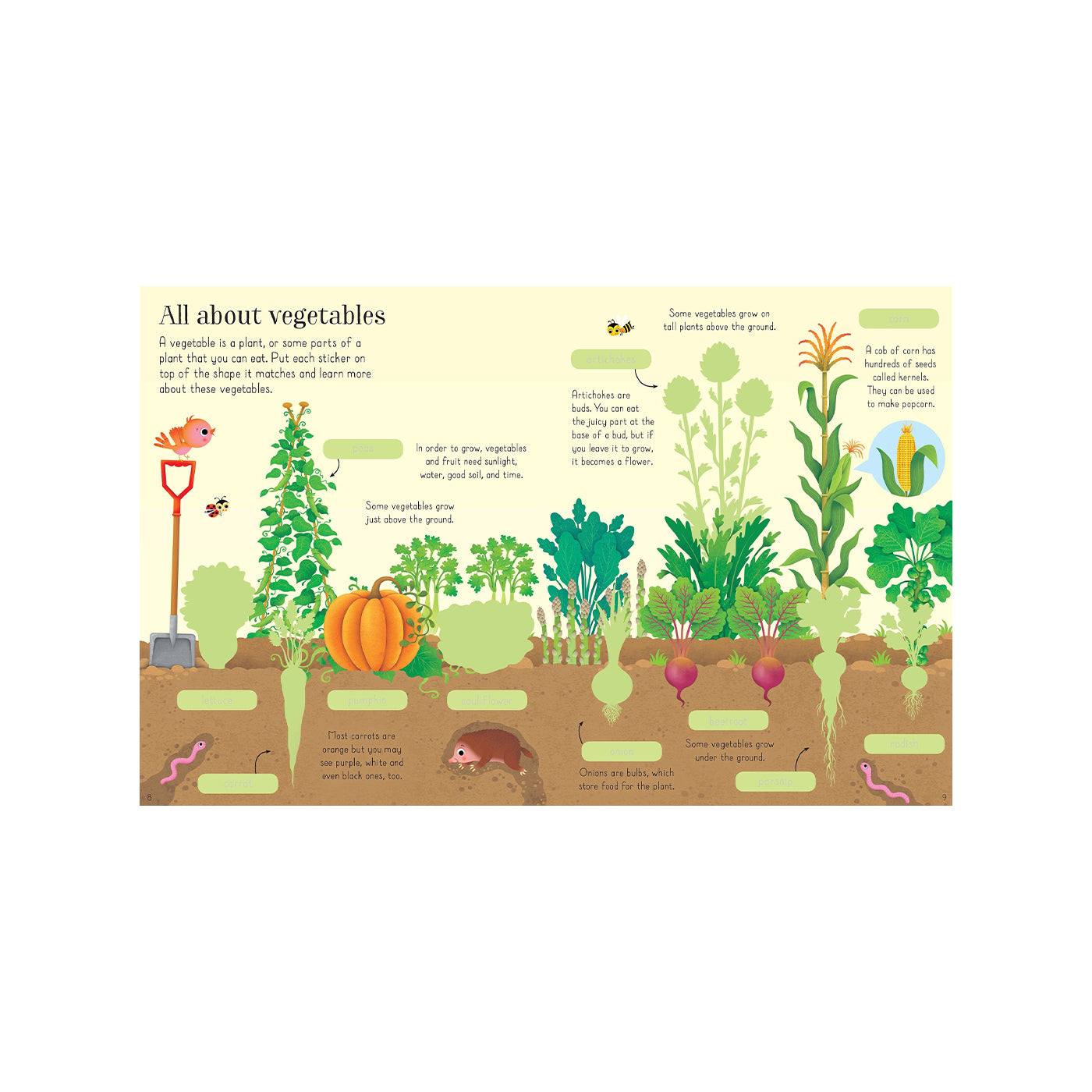 Çocukları bir seraya, bir sebze bahçesine veya çiftçi pazarına konuk eden, içeriğinde 150'den fazla çıkartma olan bu keyifli kitap, onların sebze ve meyvelerin tohumdan nasıl büyüdüğünü anlamalarına ve sağlıklı beslenme alışkanlığı kazanmalarına da yardımcı oluyor.
