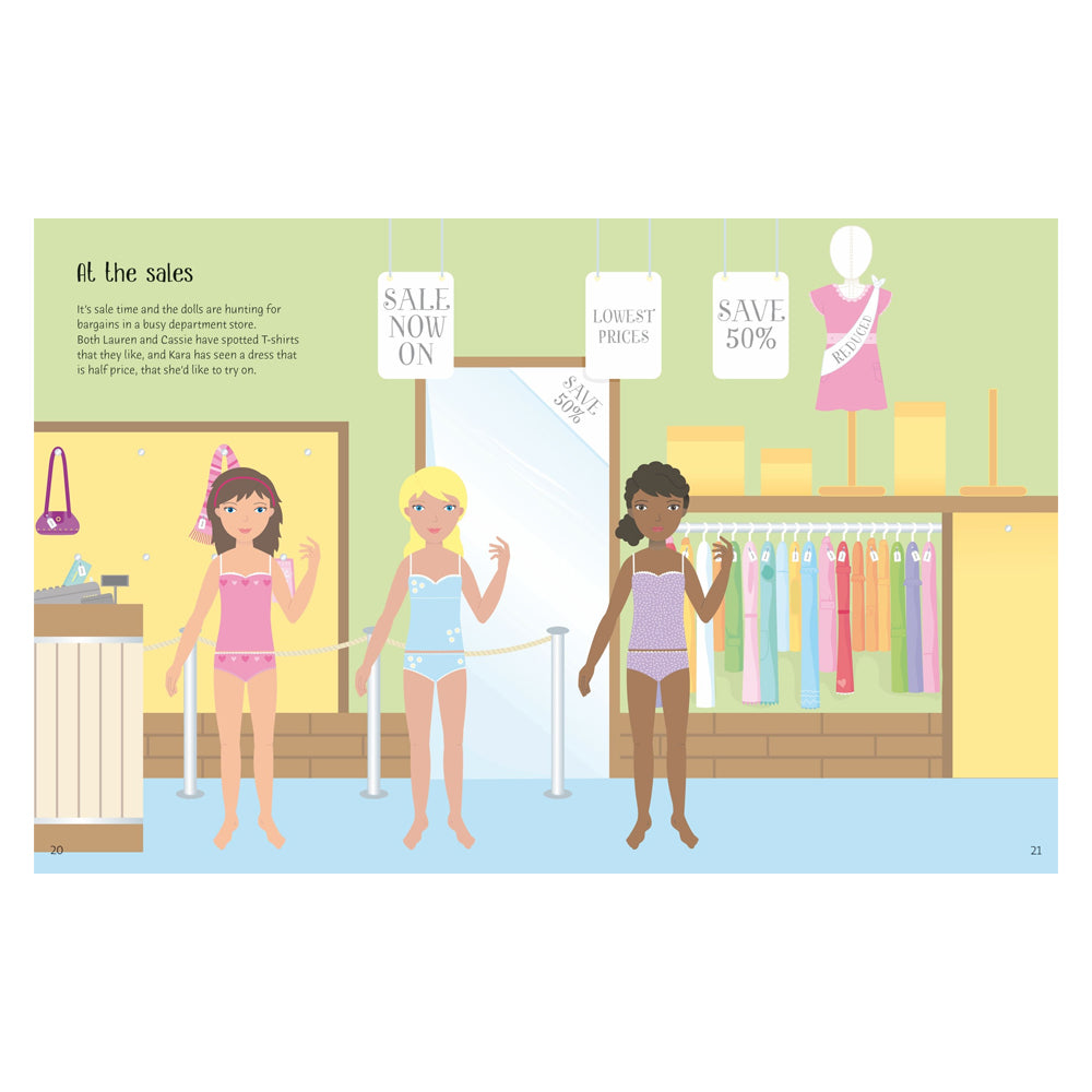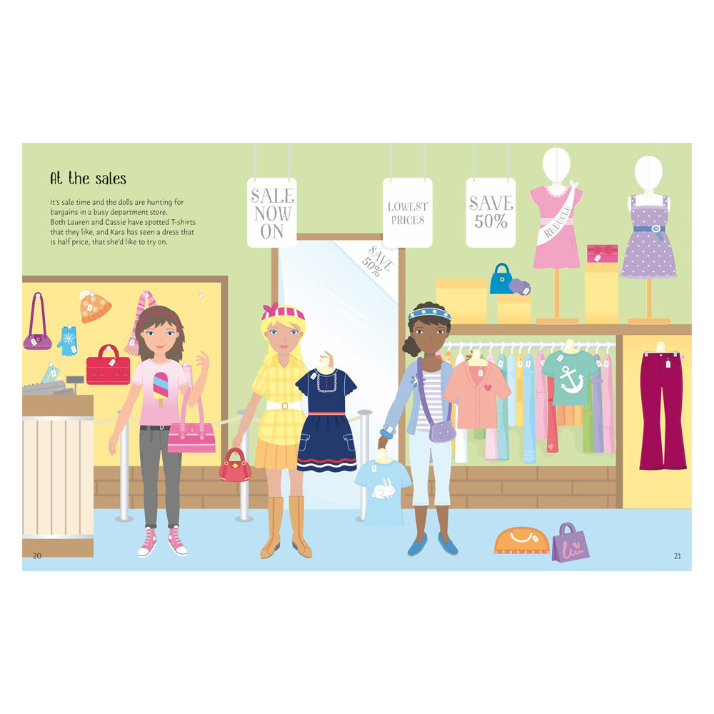 Sticker Dolly Dressing Shopping, çocukların farklı kıyafetler ve aksesuarlarla karakterleri giydirip kendi alışveriş ve sokak modası dünyalarını tasarlamalarına imkân veren eğlenceli bir sticker-aktivite kitabı. Sayfalar boyunca çeşitli sahnelerde kıyafetleri seçip sticker’larla dekore ederken, yaratıcılıkları ve hayal güçleri gelişir; aynı zamanda el-göz koordinasyonu eğlenceli biçimde desteklenir.