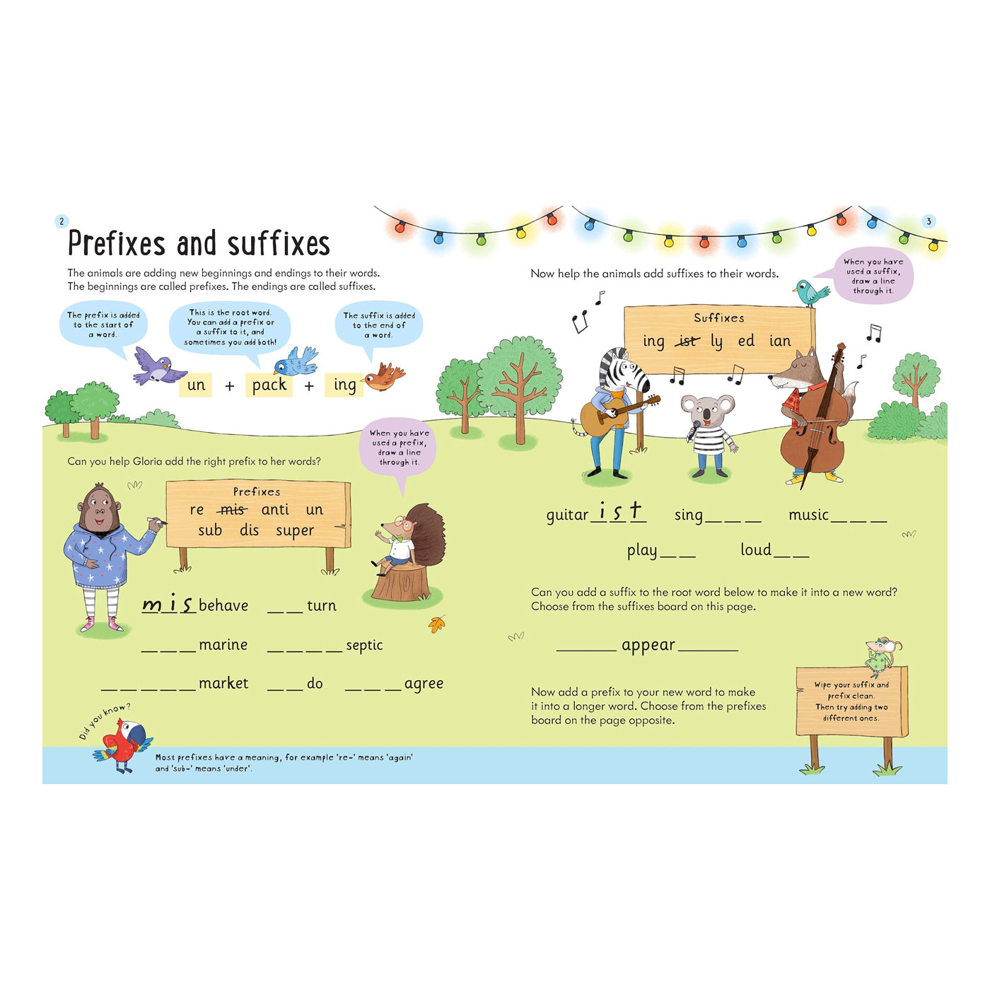 Çocukların okulda öğrendikleri İngilizce derslerini destekleyen Usborne Key Skills serisinin bir parçası olan bu eğlenceli kitap, sözcükleri olumsuz yapma, sözcük sonları ekleme ve imla testi gibi ön ek ve son eklerle ilgili etkinliklerle dolu. Silinebilir sayfaları sayesinde çocuklara diledikleri sayıda etkinlik yapma imkanı sunuyor.