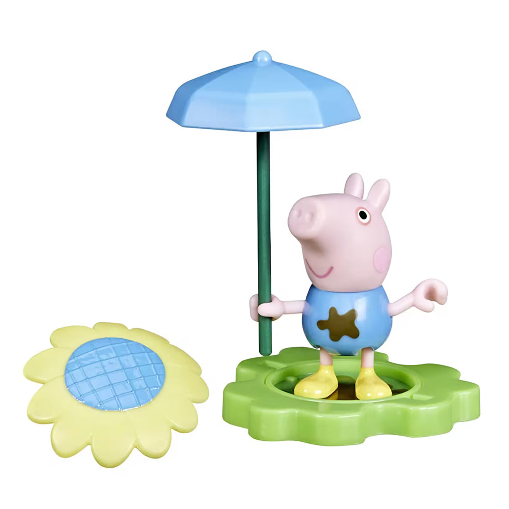 Peppa Pig dünyasının sevilen karakterleri dışarı çıkıp eğlenmeye karar verdi — ama önce havaya bir bakalım! Yağmur mu yağıyor, güneş mi açtı belli değil. Neyse ki beraberlerinde çok amaçlı bir aksesuvar var: şemsiye! İster yağmurdan korunsun, ister güneşten gölgelik olsun; şemsiyenin ucunu çıkarıp yerine çiçek takarak figürü kolayca dönüştürebilirsin. Yeşil tabanın çamur desenini çevirince çiçek desenine geçiş yapar — hava nasıl olursa olsun kendi hikâyelerini yaratıp canlandırabilirsin. Tüm figürleri toplayıp hepsini birlikte gezdirmeye ne dersin?