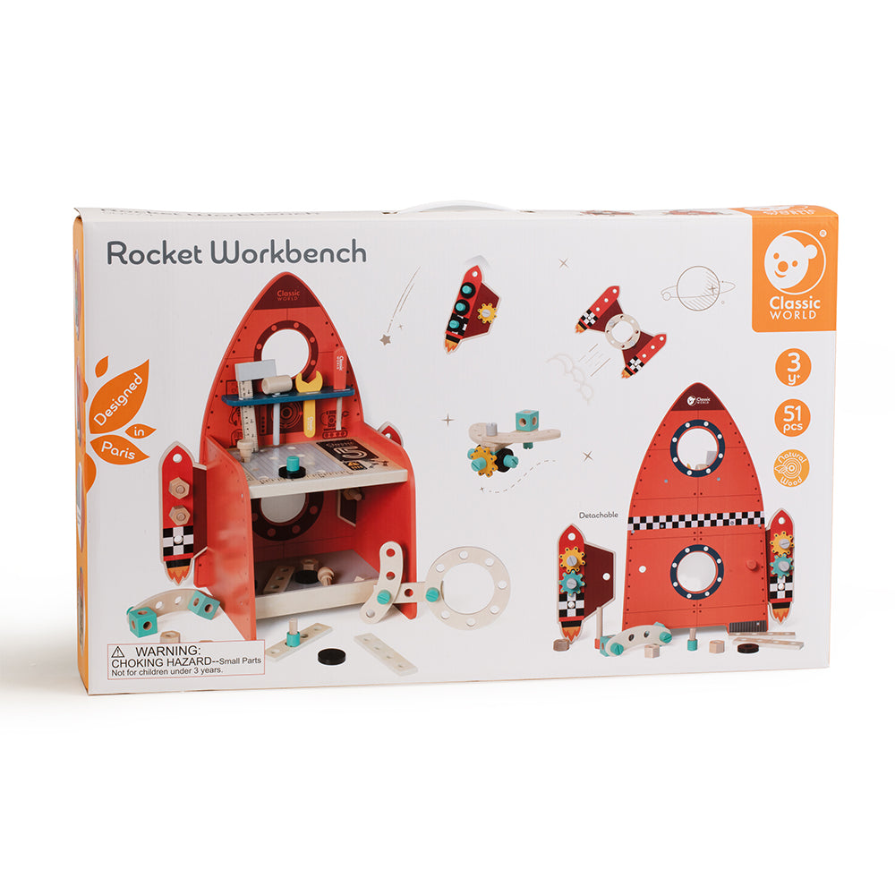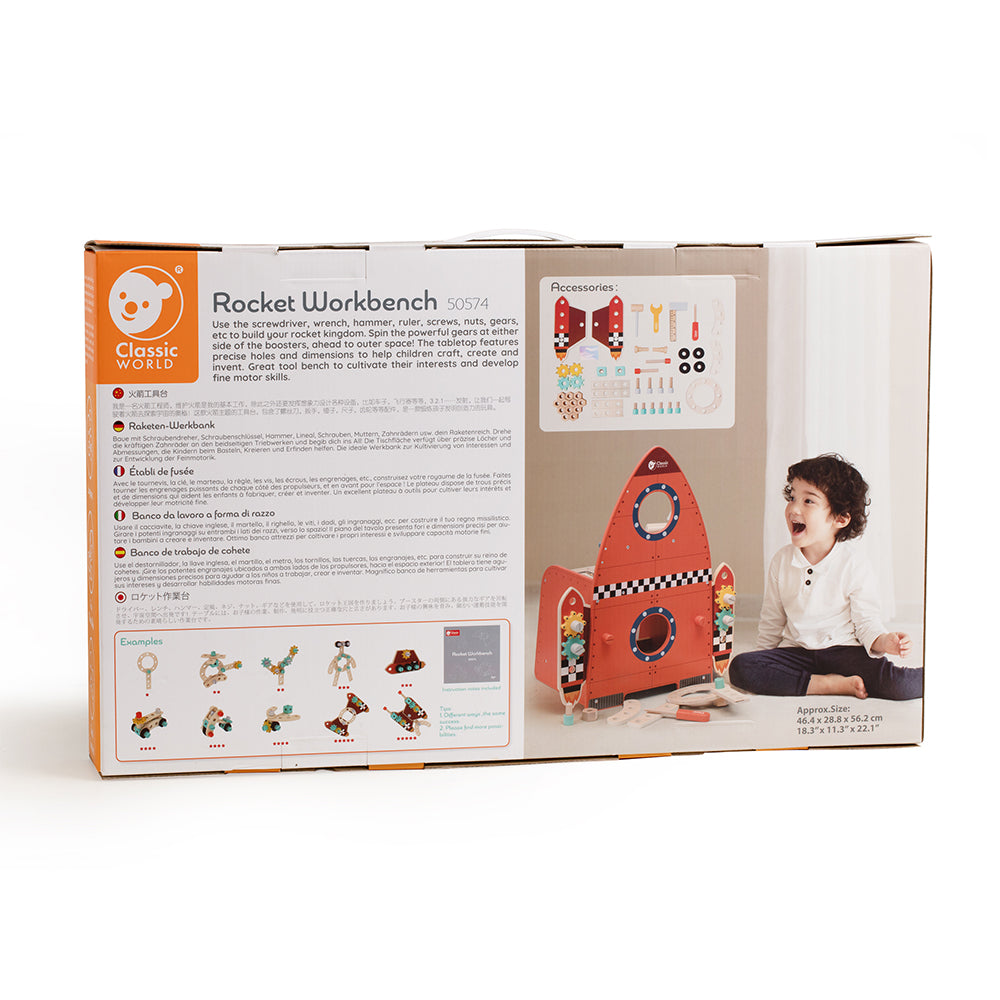 Yıldız krallığınızı inşa etmek için tornavida, anahtar, çekiç, cetvel, vida, somun, dişliler gibi araçları kullanın. Güçlü dişlileri çevirin ve uzaya doğru yol alın. Masa, çocukların yaratmalarına, inşa etmelerine ve icatlar yapmalarına yardımcı olacak hassas delikler ve boyutlarla tasarlanmıştır. Classic World Ahşap Roket Çalışma Tezgahı, çocukların ilgi alanlarını geliştirmelerine ve ince motor becerilerini artırmalarına olanak sağlar.