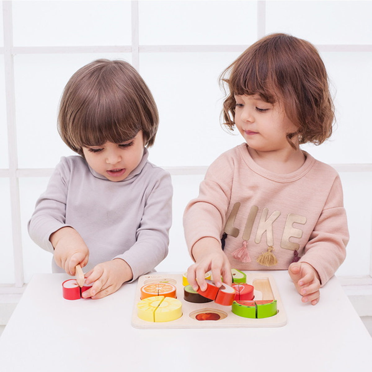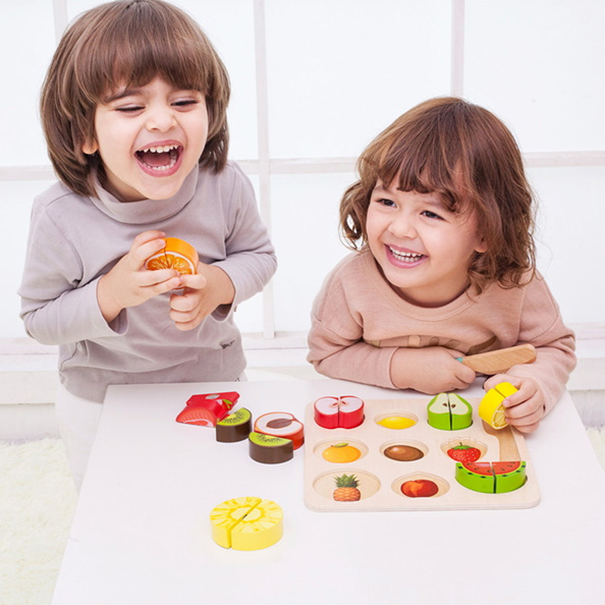 Gerçekçi meyve görselleriyle tasarlanan bu özel set, cırt cırtlı (touch fastener) yapısı sayesinde kutu içindeki ahşap bıçakla güvenle kesilip tekrar birleştirilebilir. Çocuklar ahşap kesme tahtası üzerinde meyveleri dilimlerken hem rol yapma oyunları kurar hem de el-göz koordinasyonlarını geliştirir.