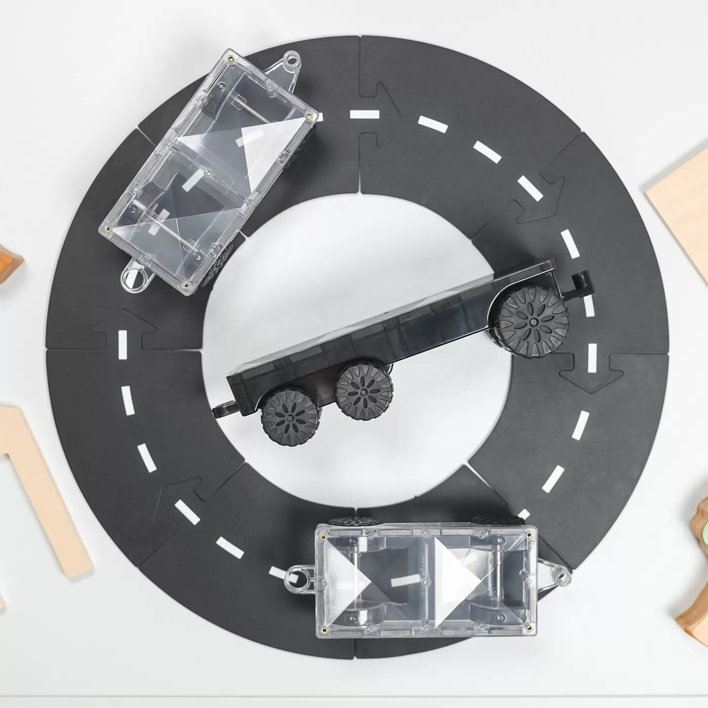 Araç meraklıları için özel olarak tasarlanmış bu paket, ters çevrilebilir gri bir taşıma tabanı, gerçek kauçuk tekerleklere sahip iki şeffaf hareket tabanı ve sınırsız araç tasarımları oluşturmanıza yardımcı olacak çeşitli mıknatıslı yapı blokları içerir.