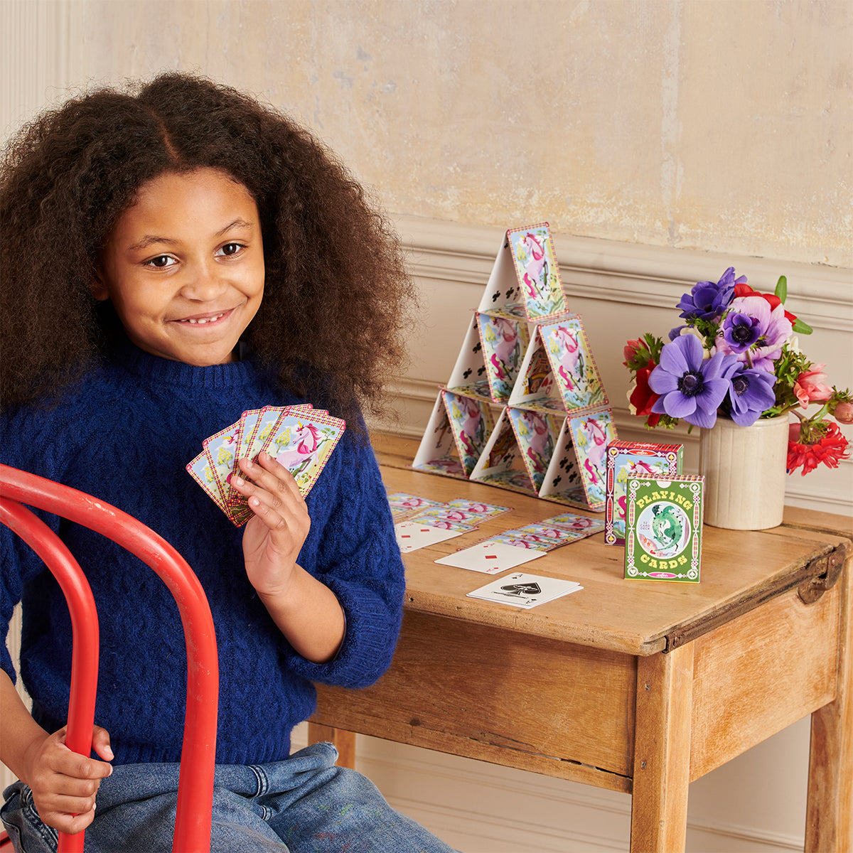 Eeboo Dragon Oyun Kartları, her destede 52 standart kart ve 2 joker bulunur. Kartlar, dayanıklı ve kolay karıştırılabilen mavi çekirdekli kartondan üretilmiştir ve klasik kart oyunları için idealdir. Ürün, geri dönüştürülmüş karton, FSC sertifikalı kâğıt ve bitkisel mürekkepler kullanılarak üretilmiştir.