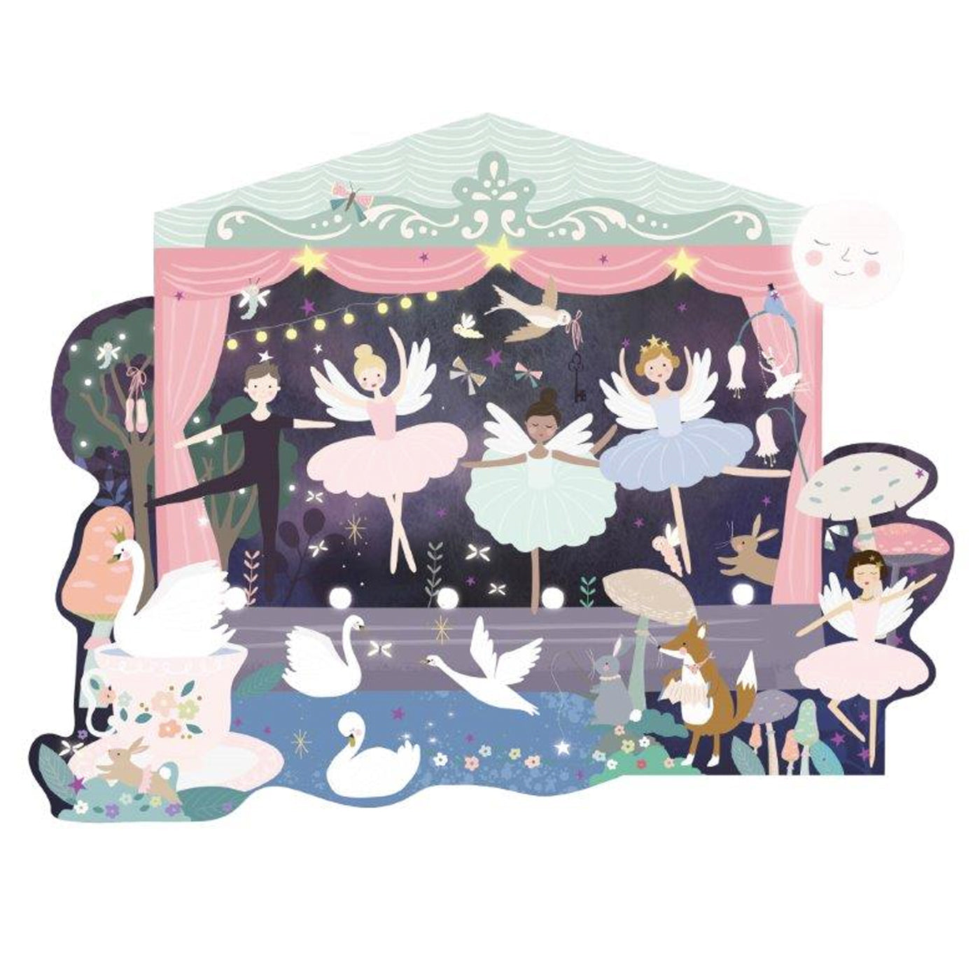 Muhteşem Bale Dansçılarımız, Büyülü Orman Dostları ile birlikte şekilli kutunun ön tarafında yer alıyor. İçeride, büyülü dans sahnesini oluşturan 80 yapboz parçası var. Hem yapboz hem de kutu parlak folyo detaylara sahiptir.