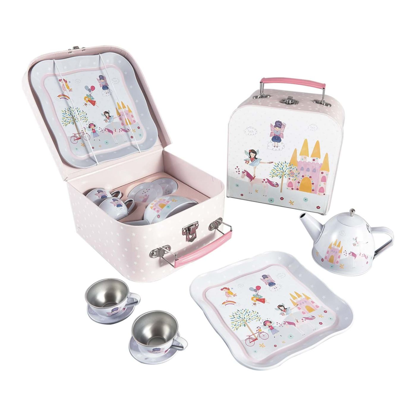 5 çayı için hazır mısınız? Peri temalı taşıma çantasında gelen bu set, 7 parçadan oluşuyor. Metal yapısı sayesinde tekrar tekrar kullanıma olanak sağlayan bu sevimli sette, hayali çay ikramı için ihtiyaç duyulan her şey bulunuyor: Çay bardağı ve tabakları, bir tepsi, kapaklı bir çaydanlık.