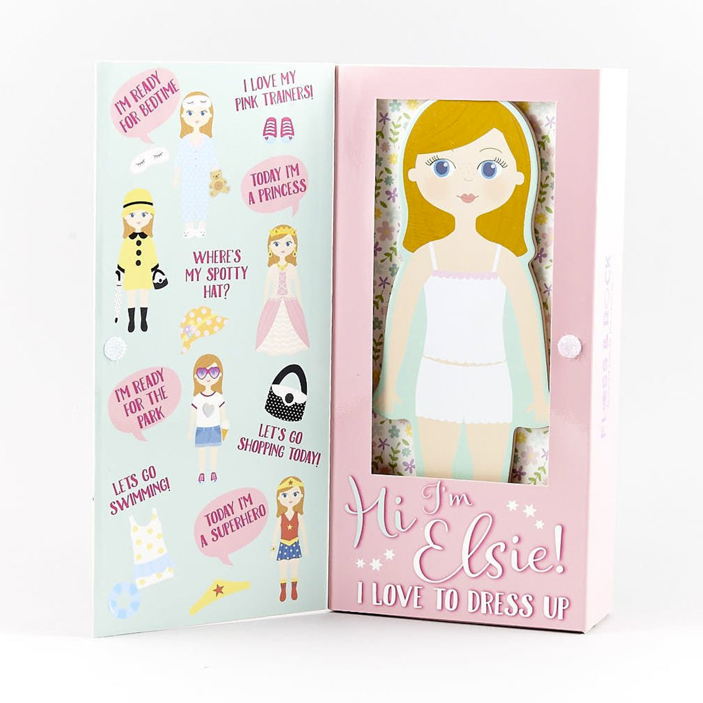 Elsie güzel giyinmeyi sever ve gerçek bir moda tutkunudur! Balo, yüzme, kır yürüyüşleri ve tabii ki uyku zamanı dahil çoğu durum için kıyafetleri var! Ayrıca her kıyafetine uyumlu oyuncak ayısı, el çantası ve yüzük gibi birçok aksesuarı var. Tüm parçalar ahşaptan yapılmıştır ve mıknatıslıdır. Ayrıca muhteşem kutusunda, bir tarafta yatak odası ve arka tarafta dış mekan manzarası olan katlanmış bir arka plan bulunur.