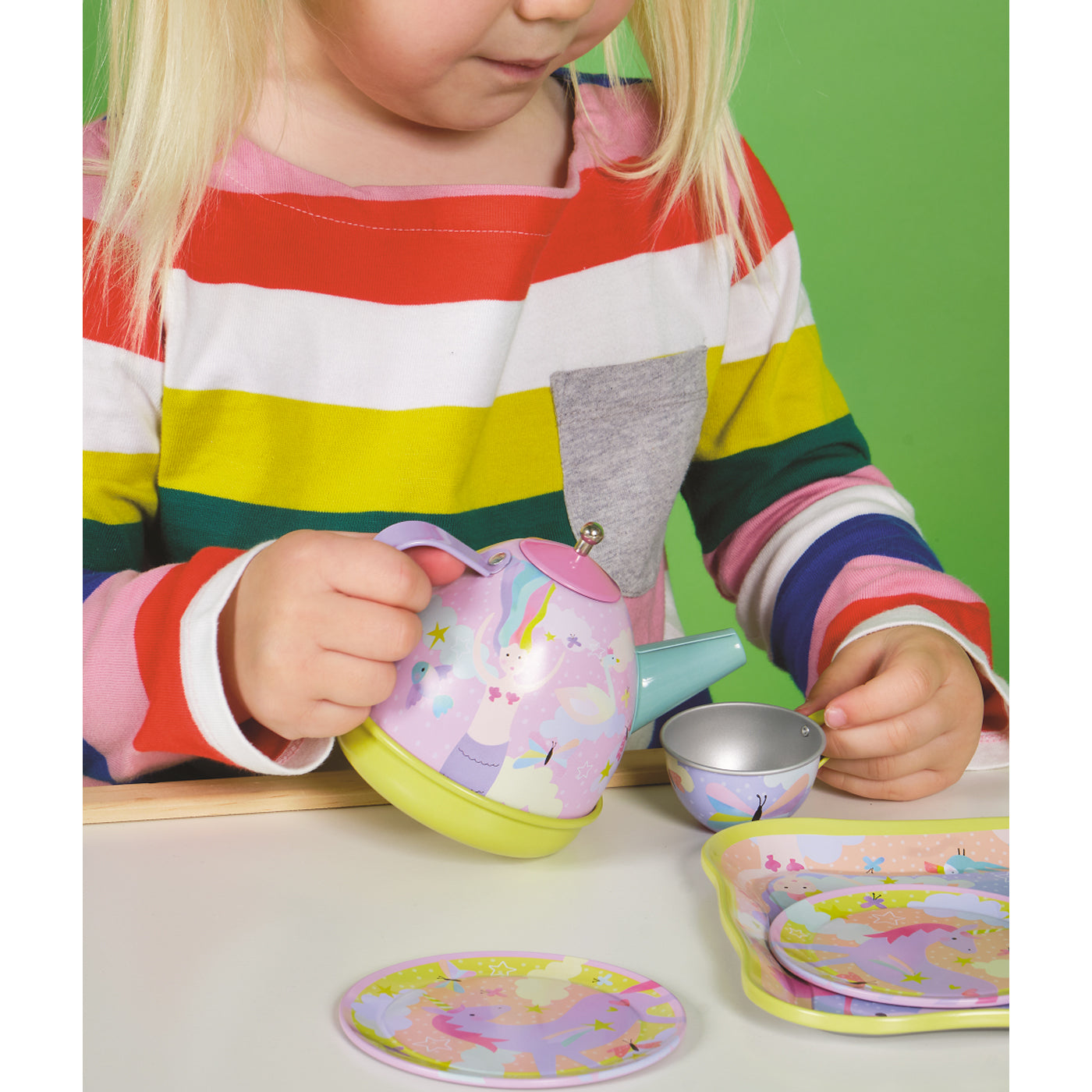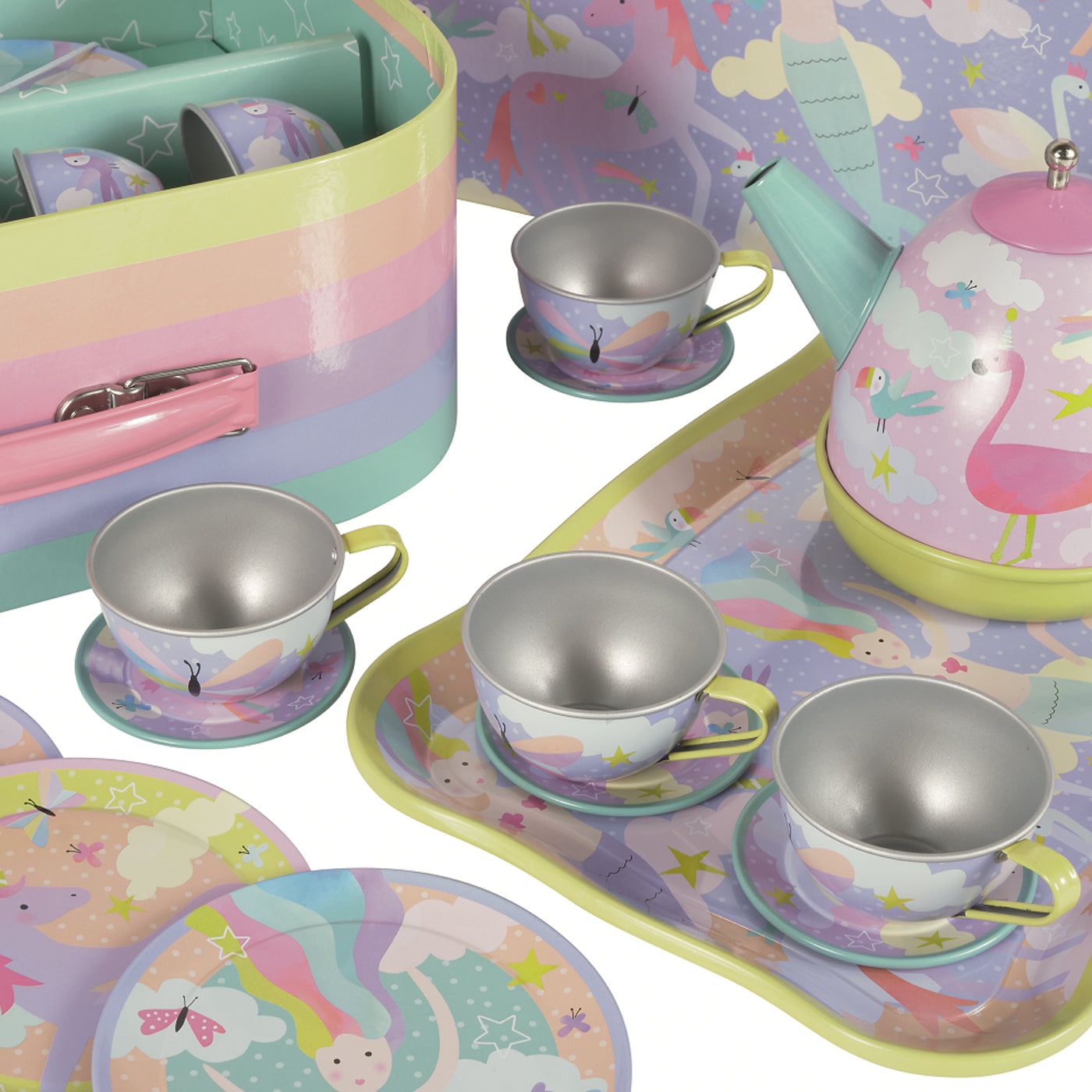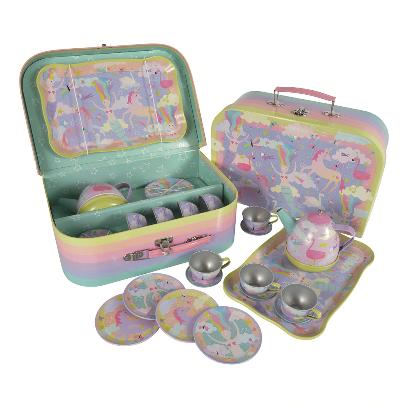 Fantastik Çay Setimiz, ikindi çayı partisi için mükemmel. Parlak renkli kutu, unicornlar, deniz kızları, flamingolar, bulutlar, yıldızlar ve daha fazlasının resimlerini içerir. İçeride harika bir müzikli çaydanlık bulacaksınız (misafirlerinize çay koyarken alttaki sarıcı çevirin ve twinkle twinkle little star şarkısını dinleyin). Ayrıca dört fincan, dört tabak, dört tabak ve bir tepsi var. Bu set, hayal gücüyle oynamayı veya arkadaşlarla oynamayı teşvik edecek küçükler için hoş bir hediye. Çay setinin güzel kutusu, bir yerden bir yere taşımayı kolaylaştıran bir taşıma sapı ile birlikte gelir.