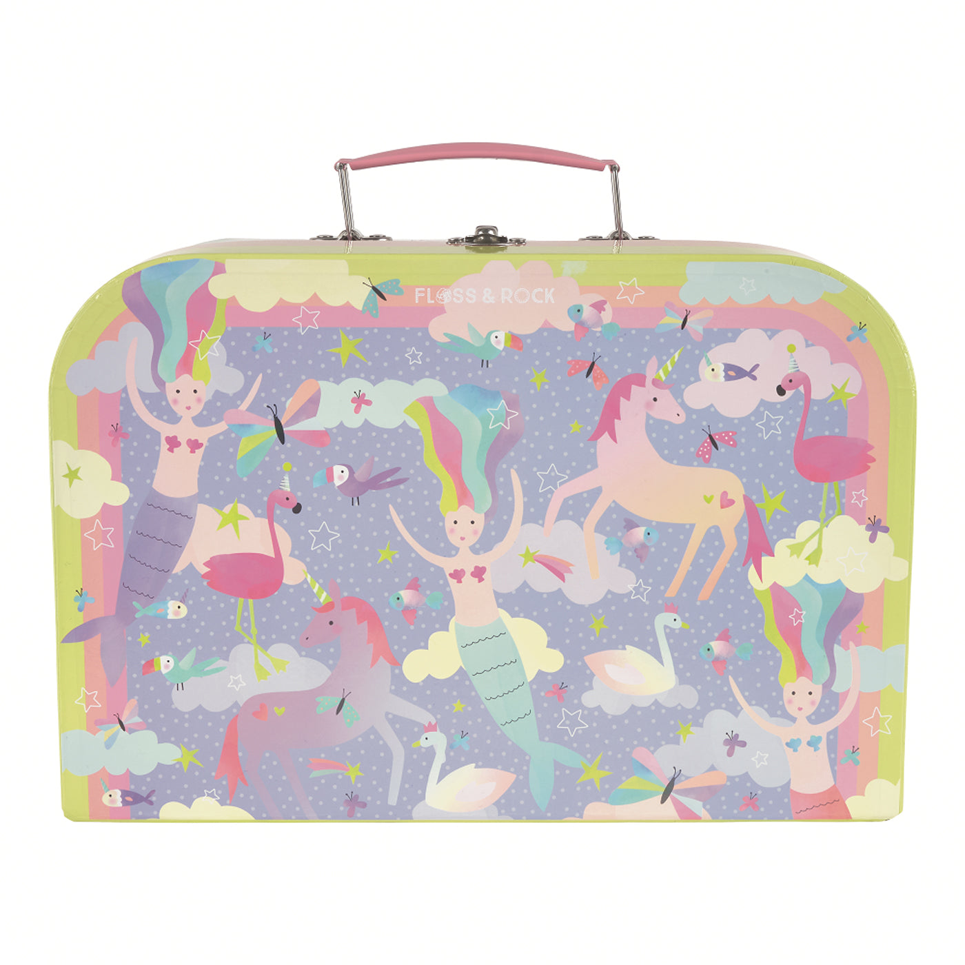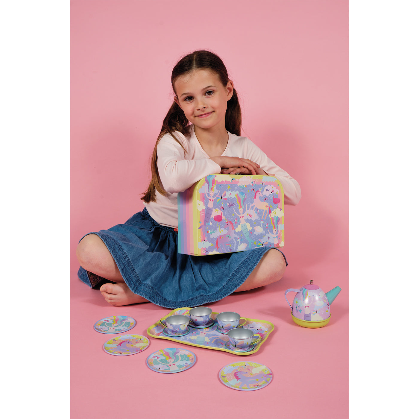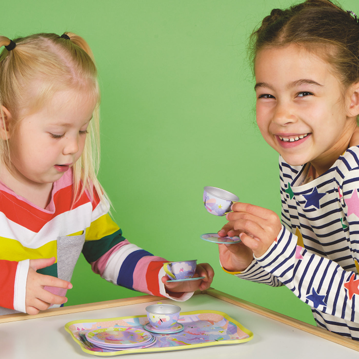 Fantastik Çay Setimiz, ikindi çayı partisi için mükemmel. Parlak renkli kutu, unicornlar, deniz kızları, flamingolar, bulutlar, yıldızlar ve daha fazlasının resimlerini içerir. İçeride harika bir müzikli çaydanlık bulacaksınız (misafirlerinize çay koyarken alttaki sarıcı çevirin ve twinkle twinkle little star şarkısını dinleyin). Ayrıca dört fincan, dört tabak, dört tabak ve bir tepsi var. Bu set, hayal gücüyle oynamayı veya arkadaşlarla oynamayı teşvik edecek küçükler için hoş bir hediye. Çay setinin güzel kutusu, bir yerden bir yere taşımayı kolaylaştıran bir taşıma sapı ile birlikte gelir.