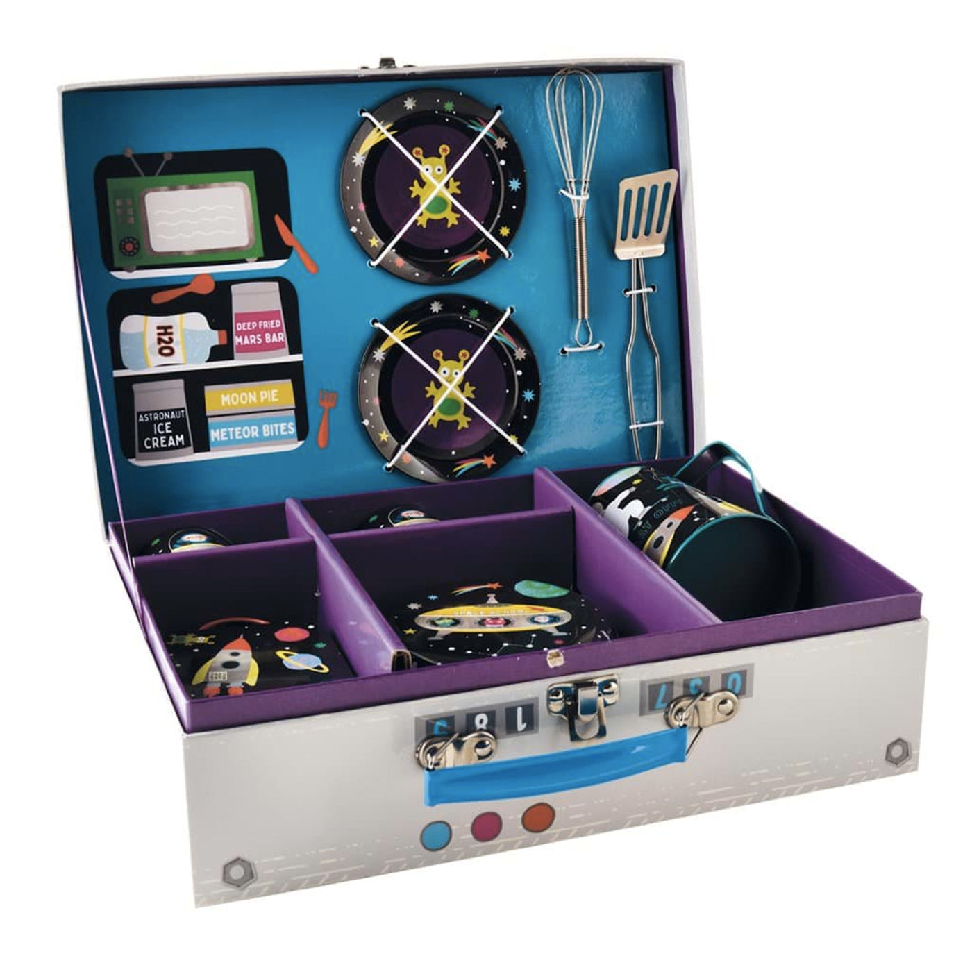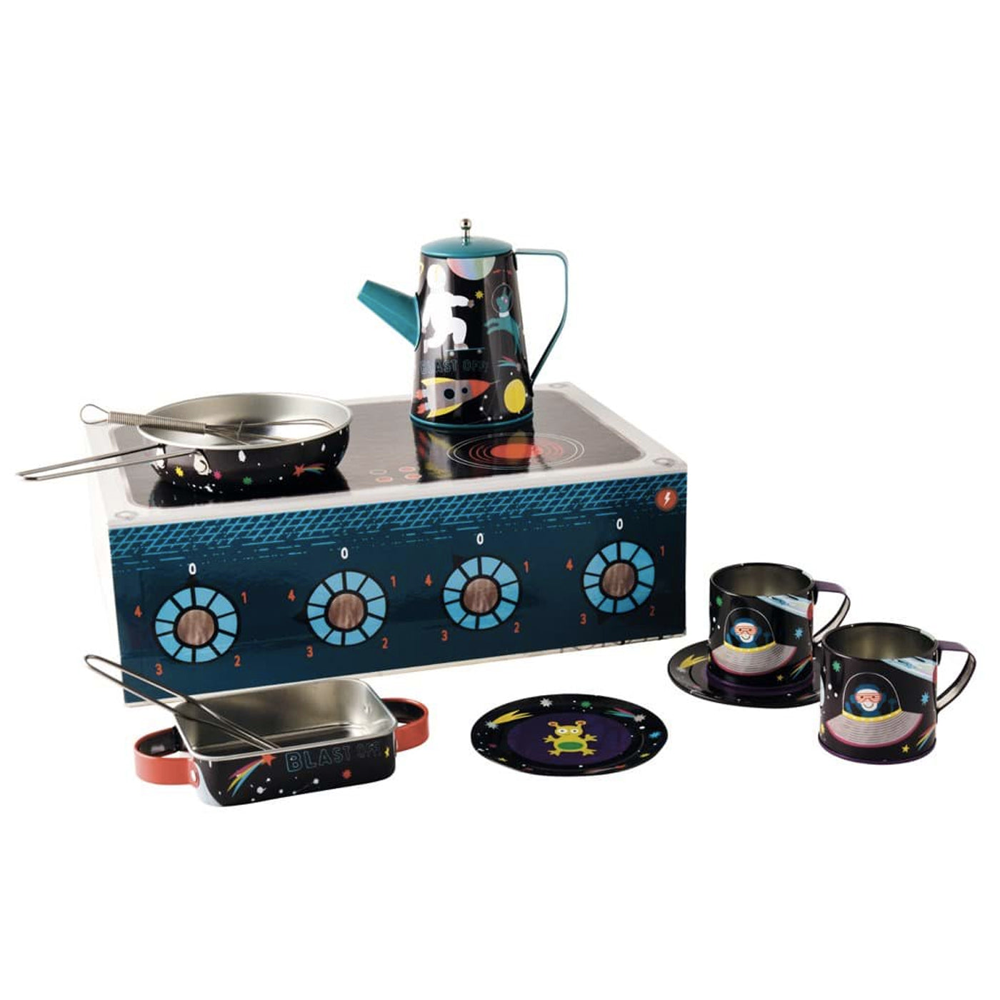 Hiç uzayda yemek pişirmenin nasıl bir şey olduğunu bilmek istediniz mi? İşte şimdi deneme şansınız… Bu parlak renkli 10 parçalı mutfak seti şunları içerir: 2 fincan, cezve ve kapak, 2 tabak, bir tava, fırın tepsisi, çırpma teli ve spatula. Taşıma çantası aynı zamanda yeniden kullanılabilir bir saklama kutusu ve gazlı oyun ocağı olarak da kullanılabilir! Kutunun ön yüzündeki holografik detaylar ve bunun genelindeki parlak renkler, kız ve erkek çocuklar için mükemmel bir hediye!