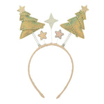 Mimi & Lula Christmas Tree Taç, Noel zamanı eğlencesiyle dolu harika yeni aksesuarlarımızdan biri! İki parlak yılbaşı ağacı, sağlam yayların üzerinde dans ederek saçlara hareket ve neşe katıyor. Simli kumaş kaplı alice bant, ortada üç simli kumaş yıldızla süslenmiştir. İki sağlam yay, üzerinde altın boncuk dizisi ve simli yıldız tepe süsüyle dekore edilmiş simli kumaş yılbaşı ağaçlarına sahiptir.