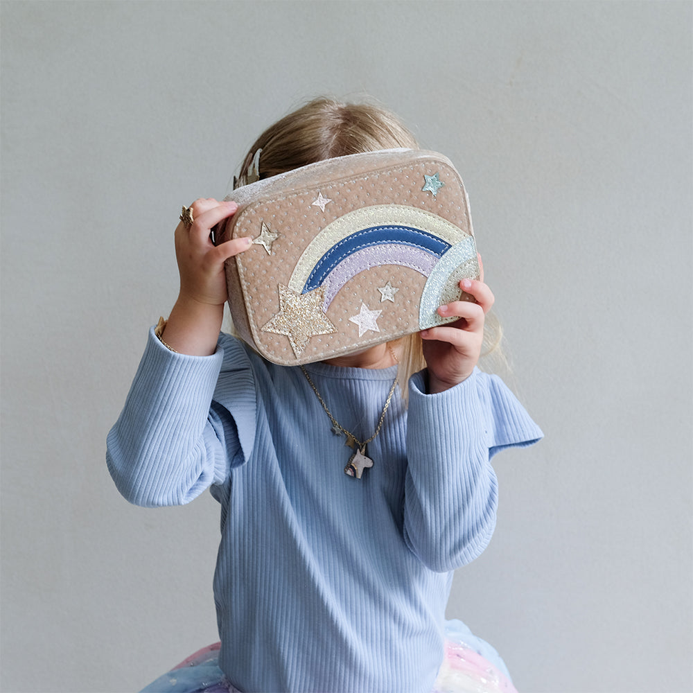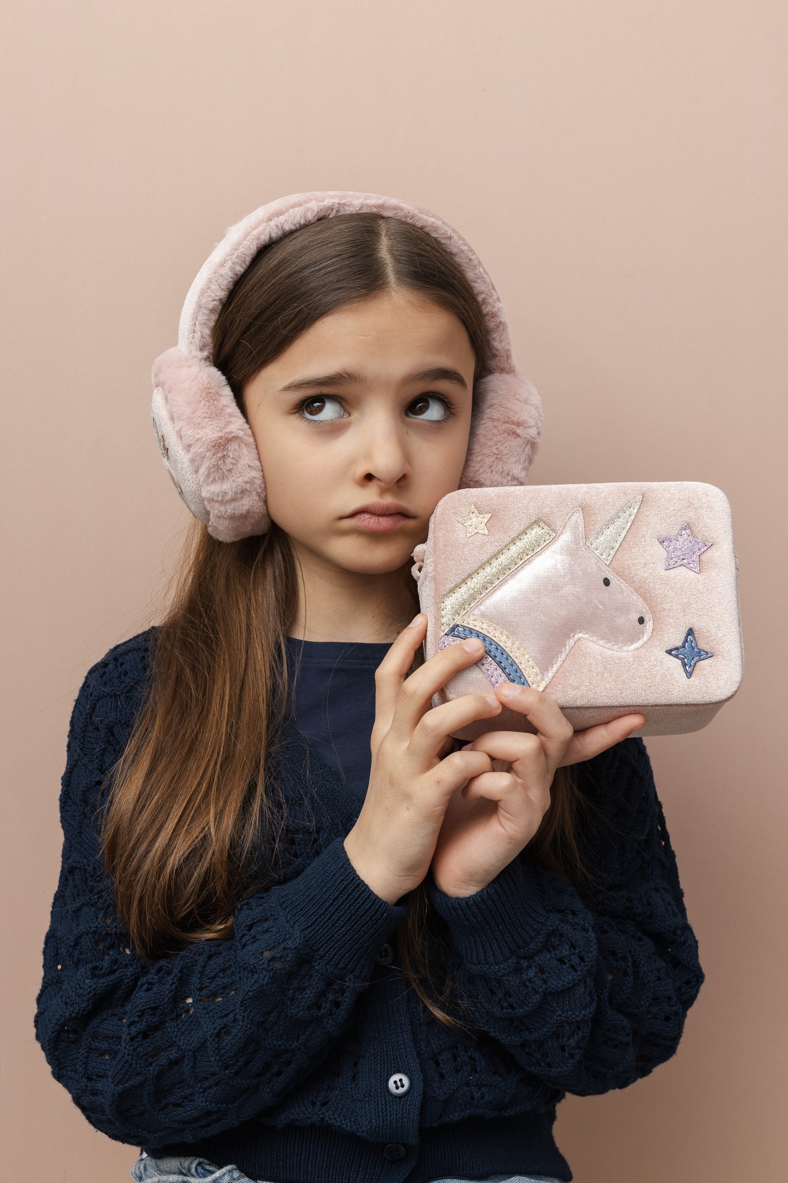 Mimi & Lula Unicorn Boxy Çanta, yumuşak pembe kadife kumaştan sert kabuklu, kutu şekilli şirin bir unicorn çantadır. Geniş iç hacmi ve büyüleyici tasarımıyla her unicorn sever için vazgeçilmez bir parçadır. Simli ve metalik kumaşlardan yapılmış unicorn tasarımına sahiptir.