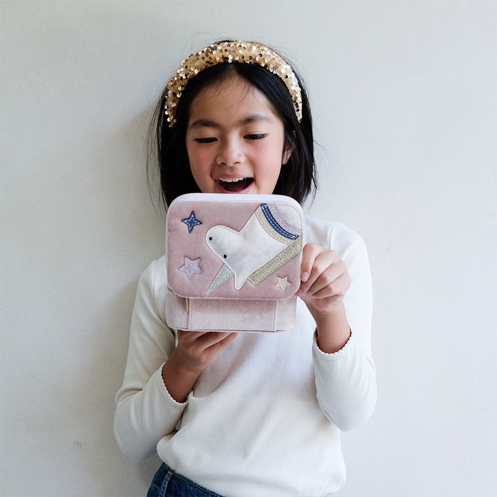 Mimi & Lula'nın ışıltılı dünyası ile tanışın. Mimi & Lula hem tokaları hem eğlenceli aksesuarları ile çocukların kişiliklerini zarafet ve stille ifade etmelerini sağlamak için özel olarak tasarlanır. Çocukların günlük kombinlerine, parti ve doğum günü elbiselerine ya da okul kıyafetlerine mükemmel şekilde eşlik eder. Unicorn Mücevher Kutusu, küçüklerin en değerli takılarını ve minik sırlarını saklayabilecekleri büyüleyici bir kutu. Parlak yıldız ve unicorn detaylarıyla süslenmiş bu sevimli kutu, yumuşak pembe kadife dokusu ve içindeki bölmeleriyle hem şık hem işlevsel bir tasarıma sahip. Küçük hazineleri düzenli tutmayı seven minikler için mükemmel bir hediye alternatifi olacak.